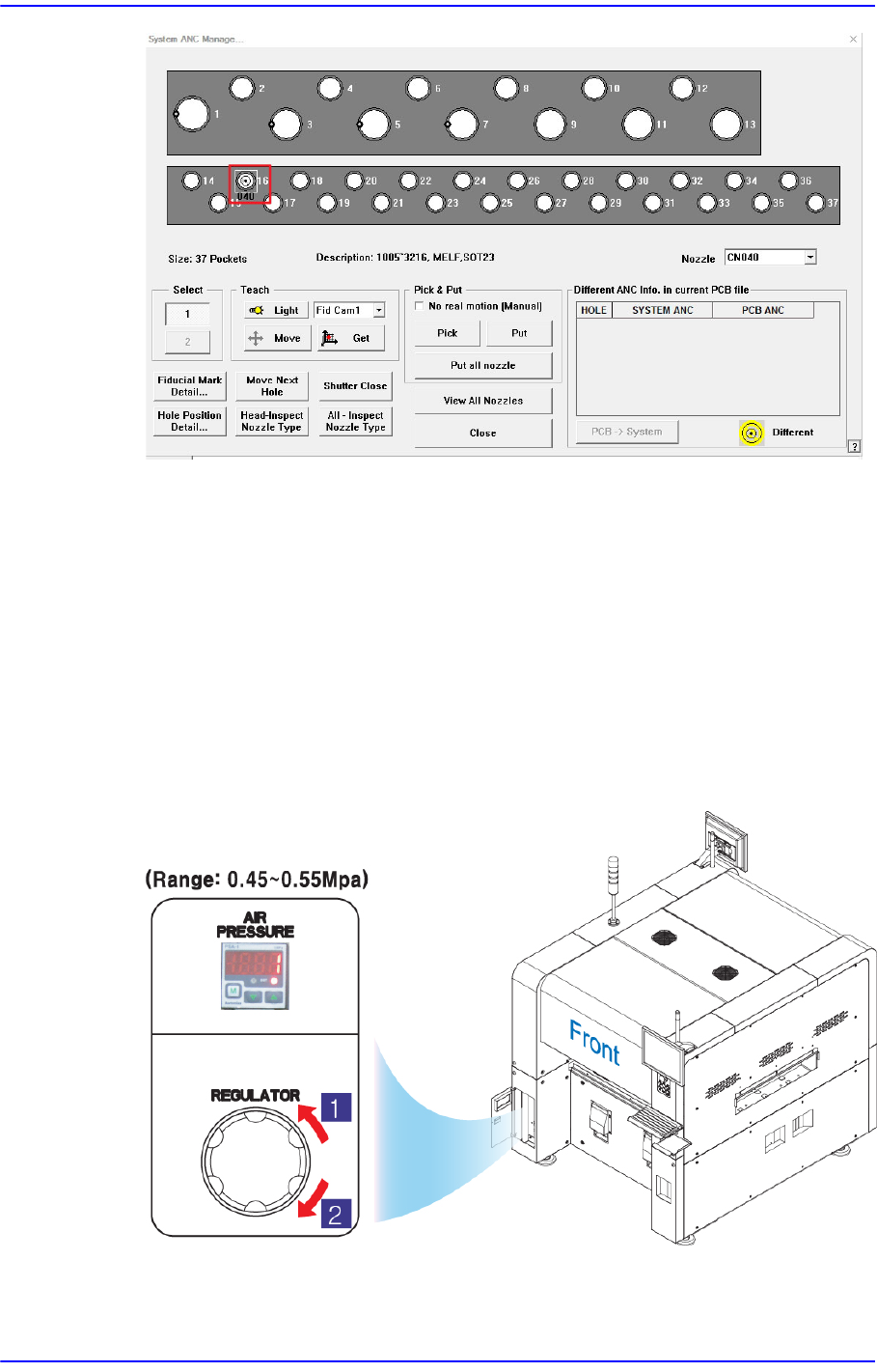1-113 MMI 错误码 ( Error Code ) 和问题解决 CNC040 吸嘴插在 Head 的状态下, 执行 Diagnostic 的 V acuum 对话框后, 用手指强 制堵住吸嘴孔, 之后按 Va c u u m O n 确认 Va c u u m 压 力是否处于 500 mmHg 以上。 若处于 500 mmHg 以下时, 确认空压系统, 吸嘴是否有问题。 $660b 照相机校正中发生空压错误。 [FREEZ…