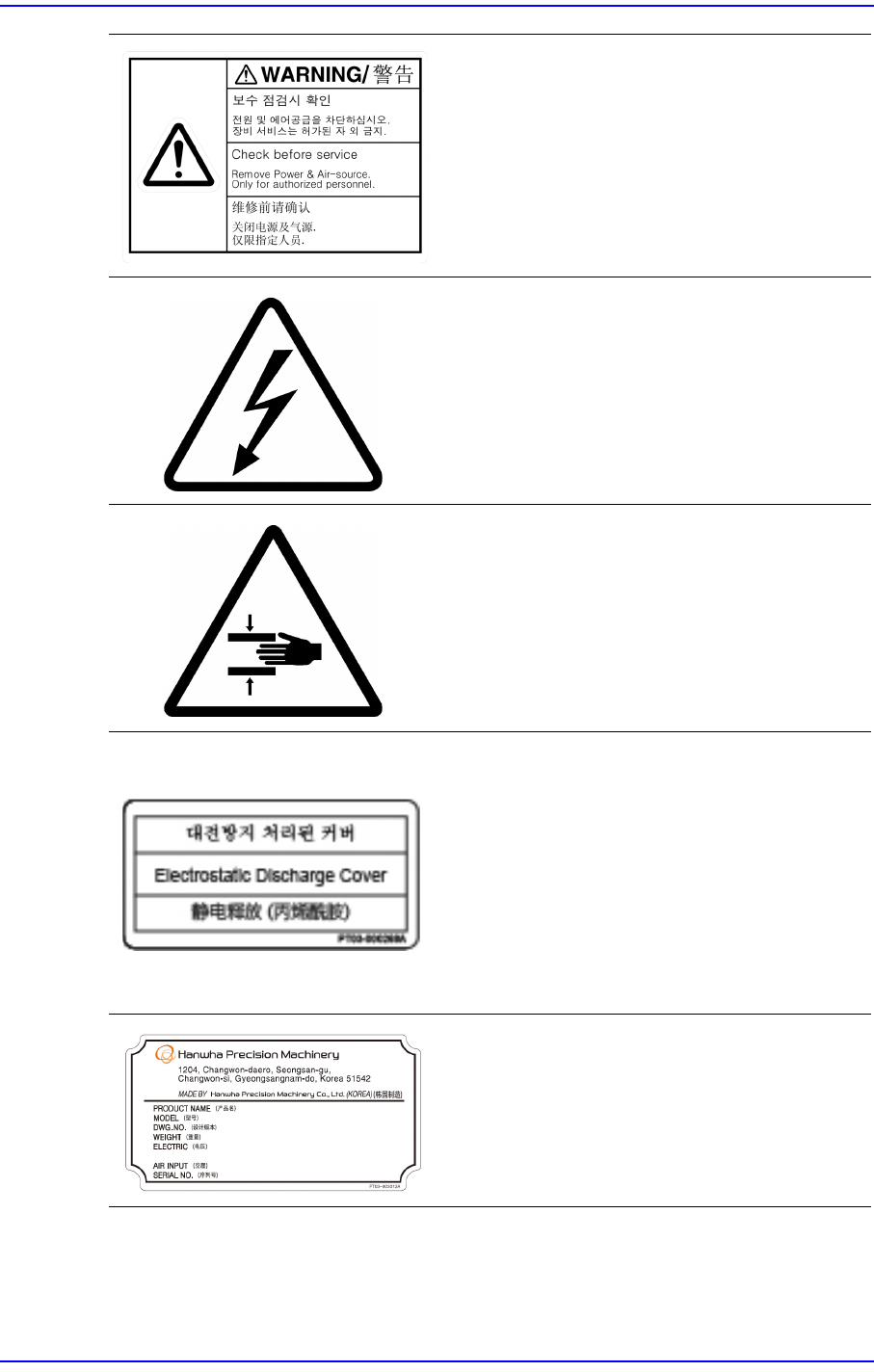 前言 vii 维修前确认 维修前请除去空气管。 盖内侧及周围连接物部位存在高电 压要注意 电击危险。 在维护和修理设备操作时一定要先 切断主电 源。 设备运行时请勿伸进手 贴有此标签处有移动体, 驱动中拆开或 打开 盖把身体的一部分伸进设备内部时 非常危 险。 维修前请停止设备。 为了维修设备及采取故障措施请首 先停止设 备。 请小心清理 Cover 。 使用干净的超细纱布沾取指定的清 洗液轻柔 擦拭 Door 的亚克力 Cover 。…
