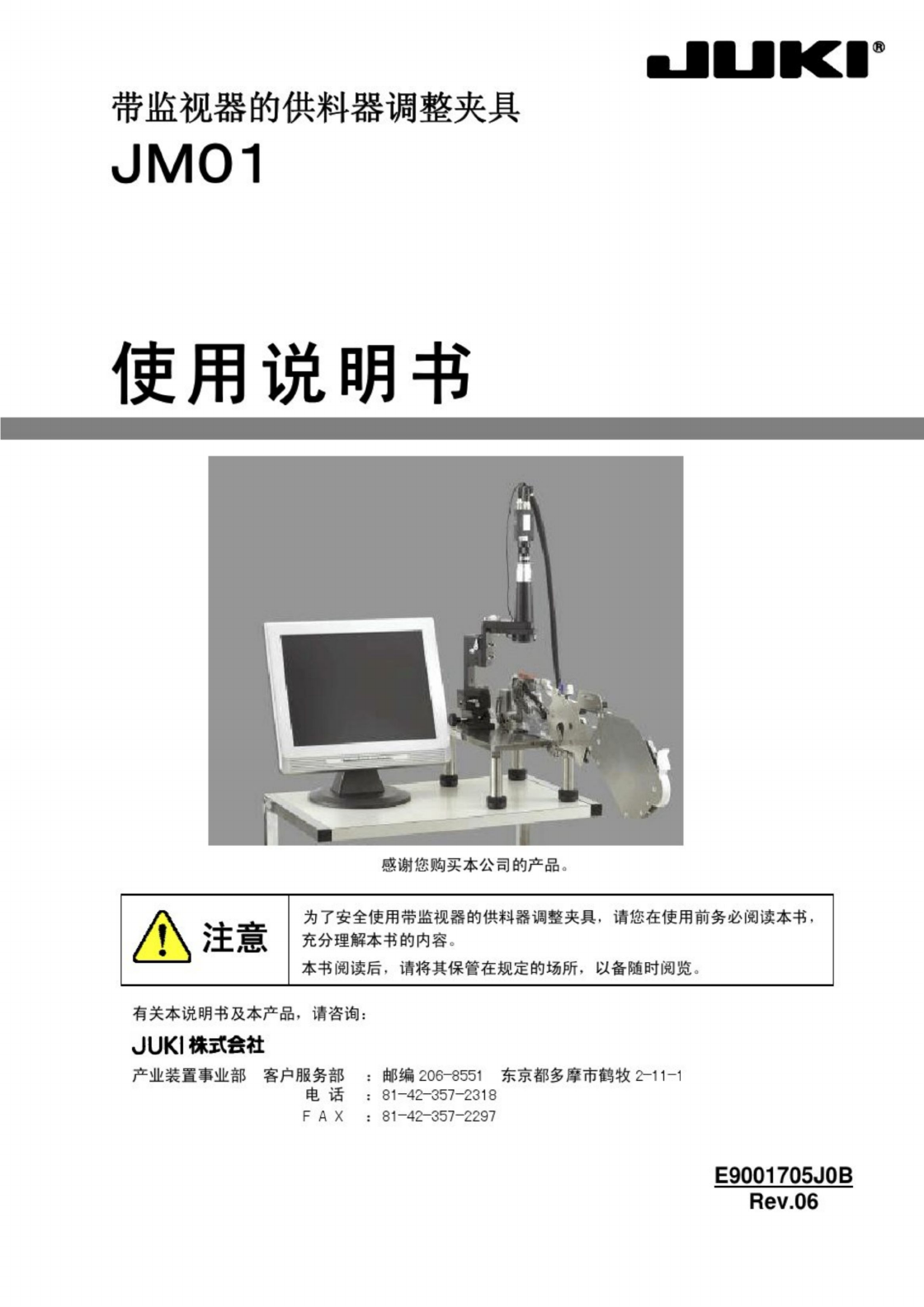 ■ JUKI ® 带监视器的供料器调整夹具 JM 01 使 用 说 明 书 者 MT 感谢您购买本公司的产品 。 为了安全使用带监视器的供料器调整夹具 . 请您在使用前务必阅读本书 . 充分理解本书的内容 t 本书阅读后 , 请将其保管在规定的场所 , 以备随时阅览 。 △ 注 意 有关本说明书及本产品 , 请咨询 JUKI 株式会社 产业装置事业部客户服务部 邮编 206 - 8551 东京都多摩市鹤牧 2 - 11 _ 1 81 -…