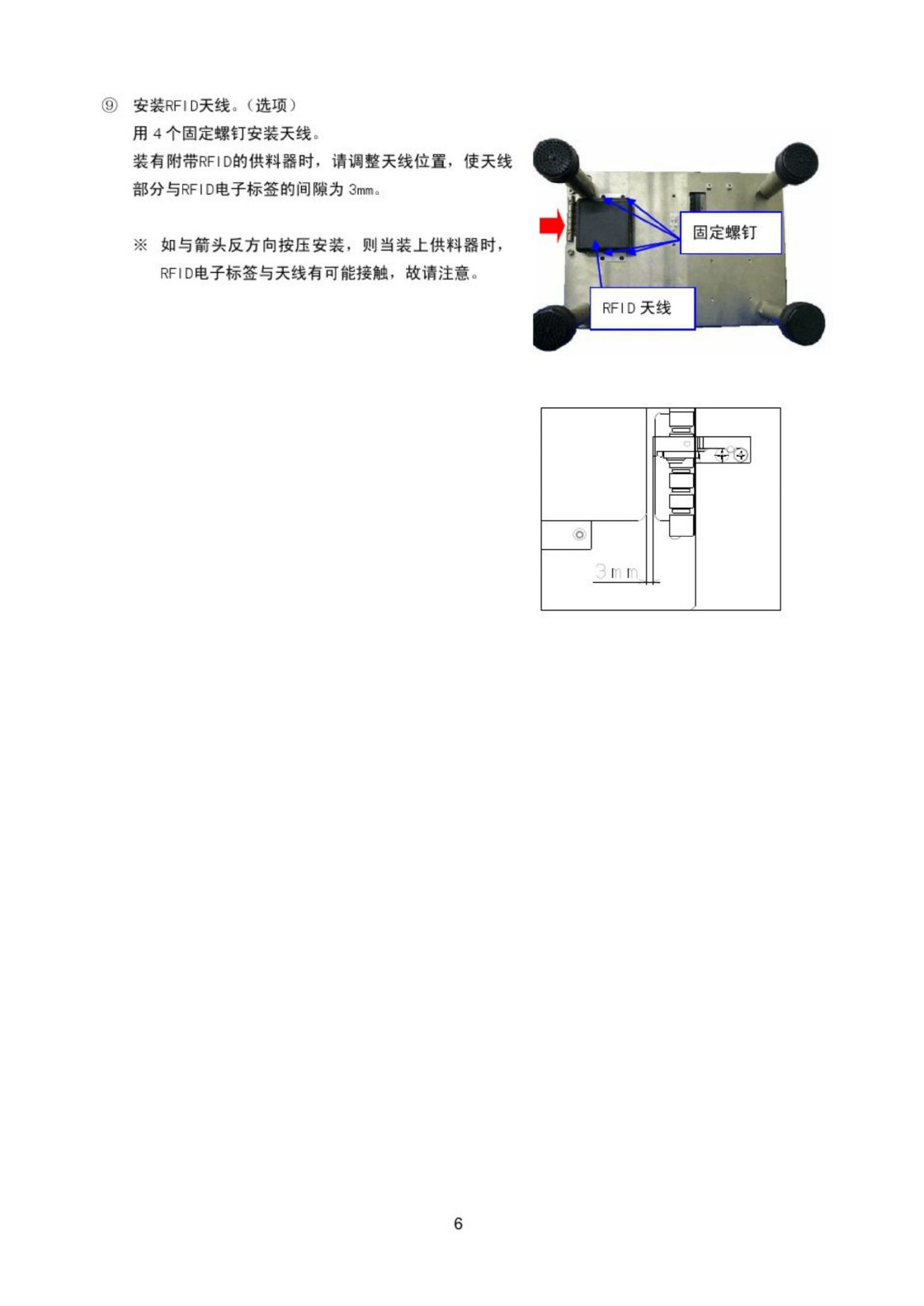 ⑨ 安装 RFID 天线 。 ( 选项 ) 用 4 个固定蠼钉安装天线 。 装有附带 RFID 的供料器时 . 请调整天线位置 . 使天线 部分与 RFID 电子标签的间隙为 3 mm 。 固定螺钉 》 如与箭头反方向按压安装 , 则当装上供料器时 , RFID 电子标签与天线有可能接触 , 故请注意 RFID 天线 6