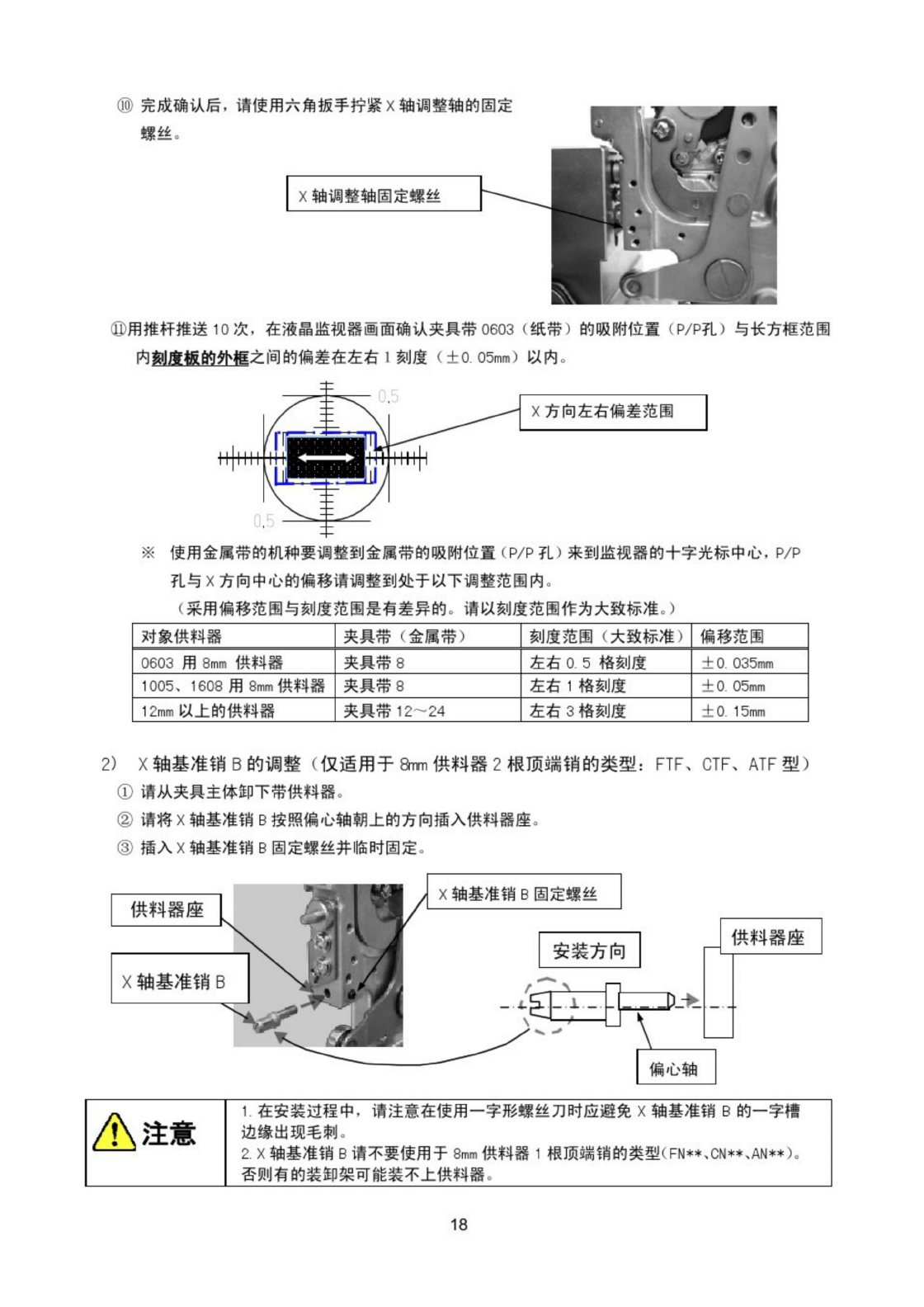 ④ 请将带供料器安装到夹具主体上 。 ⑤ 一边看着监视器一边调整 X 轴 . 使用一字形螺丝刀调整 X 轴基准销 B . 将 X 轴基准销 B 的位 M 调整到夹具带 0603 ( 纸带 ) 的吸附位置 ( P / P 孔 ) 与长方形外框之间间 _ 均等 . ※ 使用金属带的机种要调整到金属带的吸附位置 ( P / P 孔 ) 处于监视器的十字光标中心 。 P / P 画面 wall | Y 方向 ( - ) [ : | x 方邮 :…