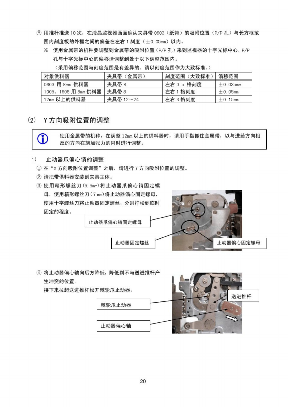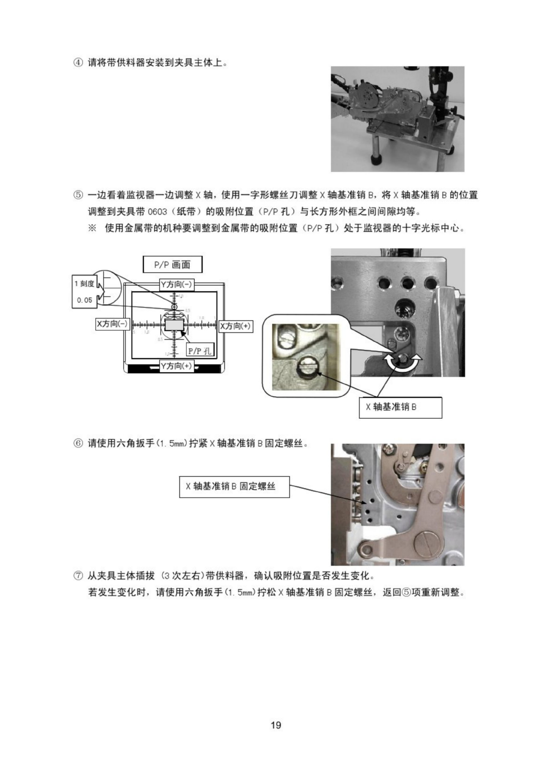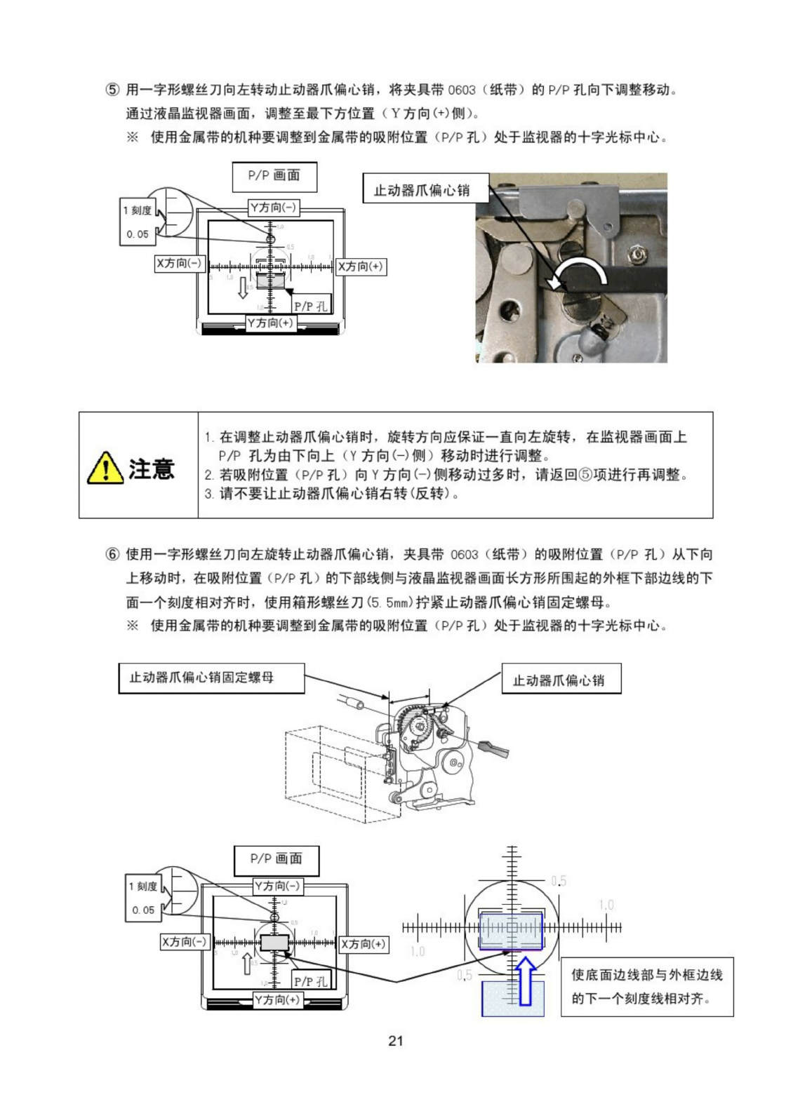 ⑧ 用推杆推送 10 次 , 在液晶监视器画面确认夹具带 0603 ( 纸带 ) 的吸附位置 ( P / P 孔 ) 与长方框范 围内刻度板的外框之间的偏差在左右 1 刻度 ( 士 0.05 mm ) 以内 。 使用金属带的机种要调整到金属带的吸附位置 ( P / P 孔 ) 来到监视器的十宇光标中心 , P / P 孔与十字光标中心的偏移请调整到处于以下调整范围内 。 ( 采用偏移范围与刻度范围是有差异的 t 请以刻度范围作为大致…