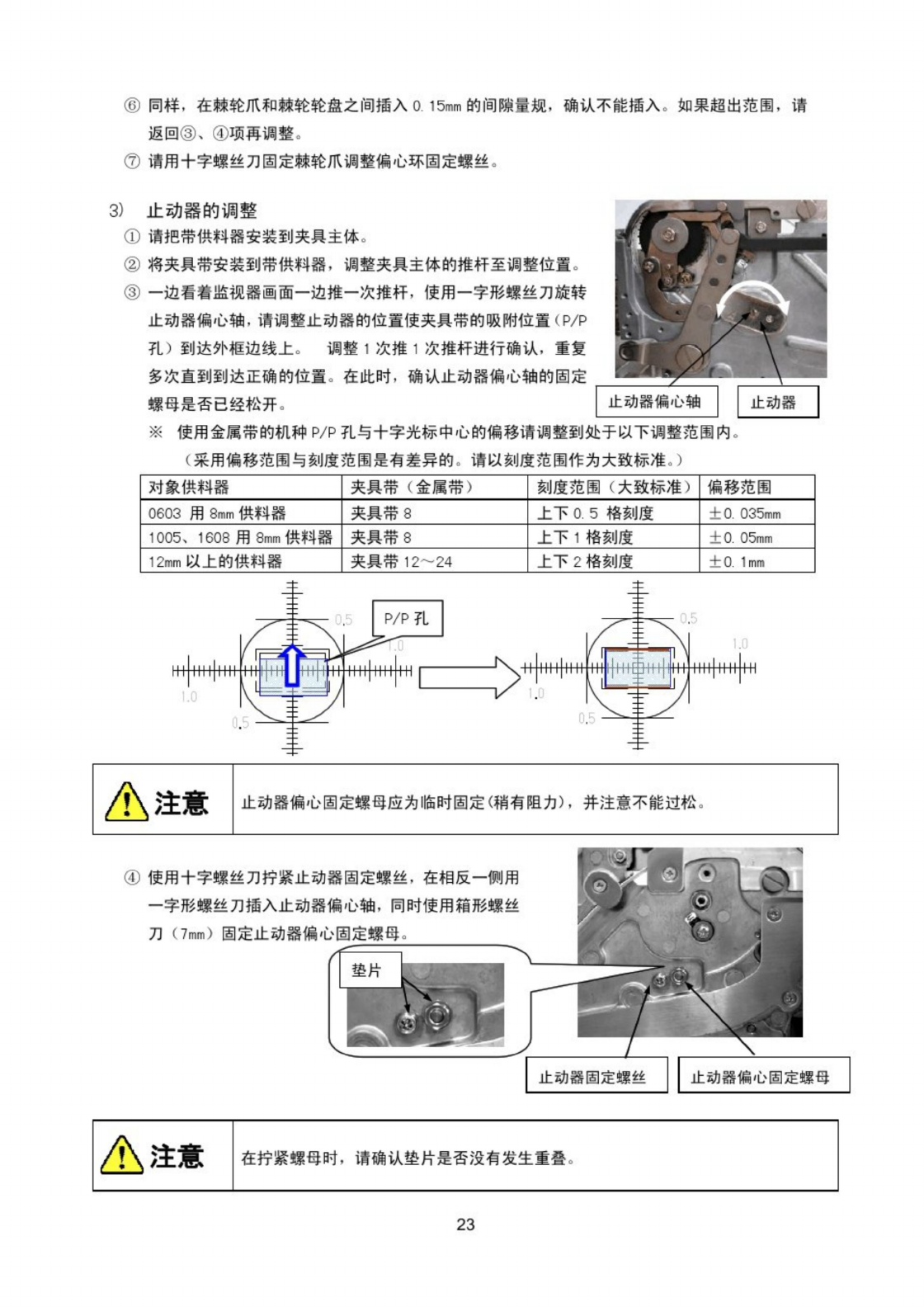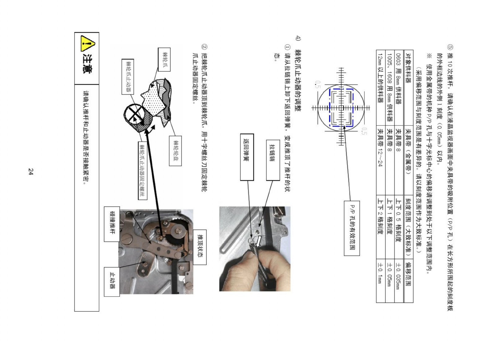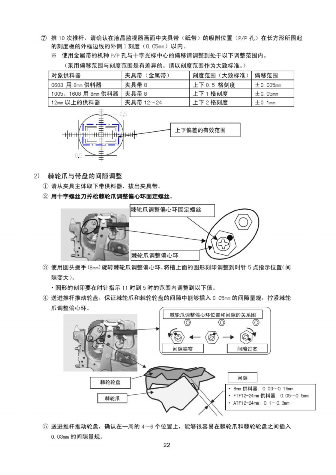 ⑥ 同样 , 在棘轮爪和棘轮轮盘之间插入 0 15 _ ! 的间隙量规 , 确认不能插入 。 如果超出范围 , 请 返回 ③ 、 ④ 项再调整 a ⑦ 请用十字螺丝刀固定棘轮爪调整偏心环固定螺丝 . 3 ) 止 动 器 的 调 整 ① 请把带供料器安装到夹具主体 。 ② 将夹具带安装到带供料器 . 调整夹具主体的推杆至调整位置 。 ③ 一边看着监视器画面一边推一次推杆 . 使用一字形螺丝刀旋转 止动器偏心轴 , 请调整止动器的位置使夹具…