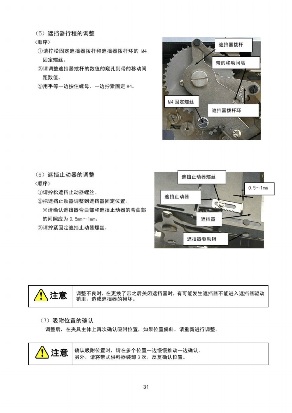7 - 4 - 2 FTFR 的调整 需要时 . 请进行以下调整 需要调整多个位置时 , 请一定按照以下顺序编号进行调整 。 ( 1 ) X 方向吸附位置的调整 ( 2 ) Y 方向吸附位置的调整 ( 3 ) 棘轮爪和棘轮圆盘的间陳调整 ( 4 ) 止动器的调整 ( 5 ) 棘轮爪止动器的调整 ( 6 ) 辅助止动器爪的调整 ( 7 ) 遮挡器行程的调整 ( 8 ) 遮挡器止动器的调整 ( 9 ) 吸附位 M 的确认 A 注意 上应…