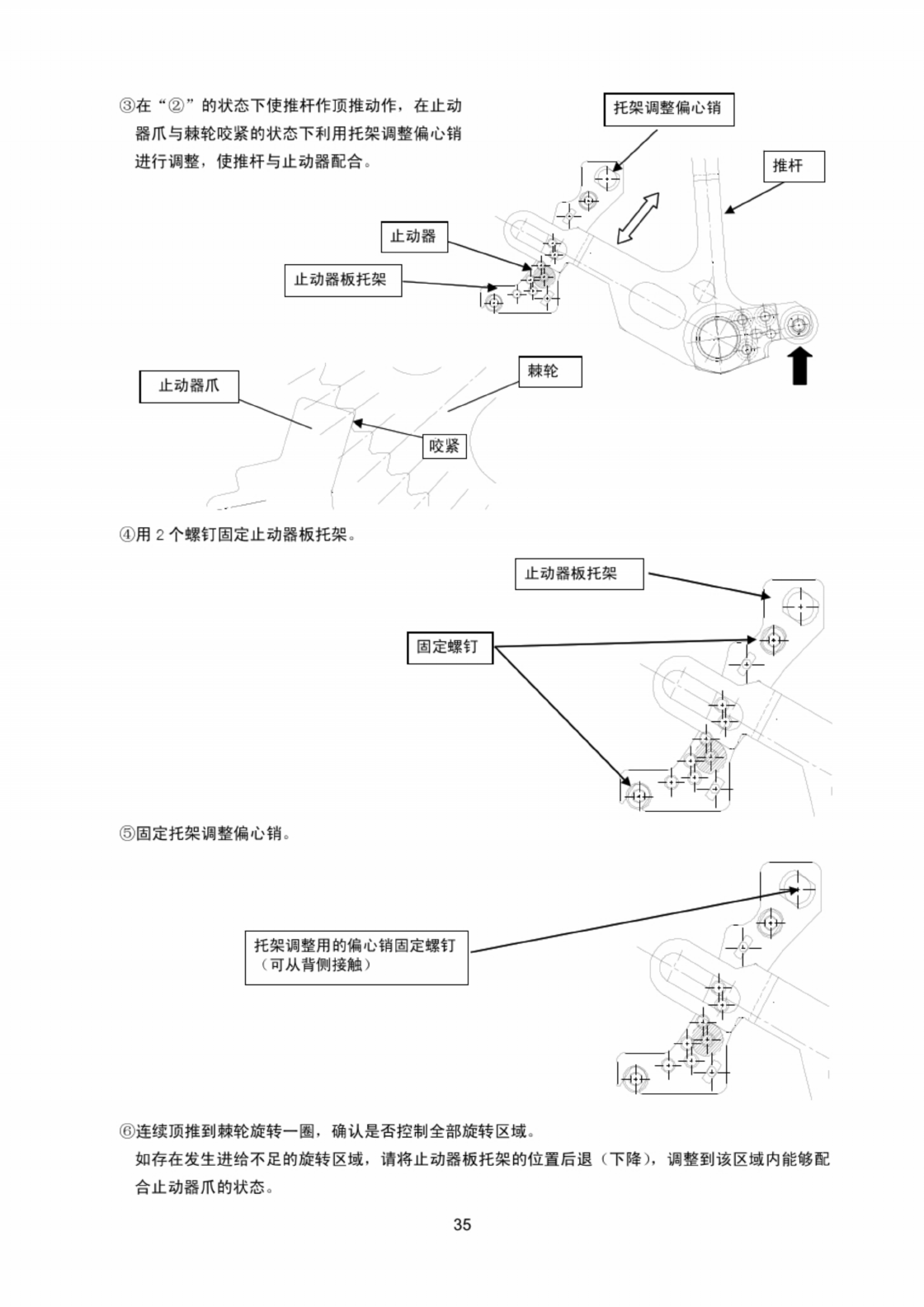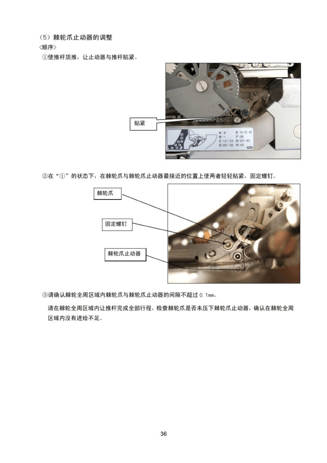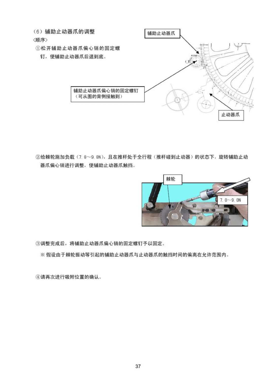 ( 5 ) 棘轮爪止动器的调整 〈 顺序 〉 ① 使推杆顶推 , 让止动器与推杆贴紧 u ② 在 “ ① ” 的状态下 , 在棘轮爪与棘轮爪止动器最接近的位置上使两者轻轻贴紧 , 固定螵钉 。 棘轮爪 固定螺钉 棘轮爪止动器 ③ 请确认棘轮全周区域内棘轮爪与棘轮爪止动器的间隙不超过 0 . 1 mm 。 请在棘轮全周区域内让推杆完成全部行程 , 检查棘轮爪是否未压下棘轮爪止动器 , 确认在棘轮全周 区域内没有进给不足 。 36