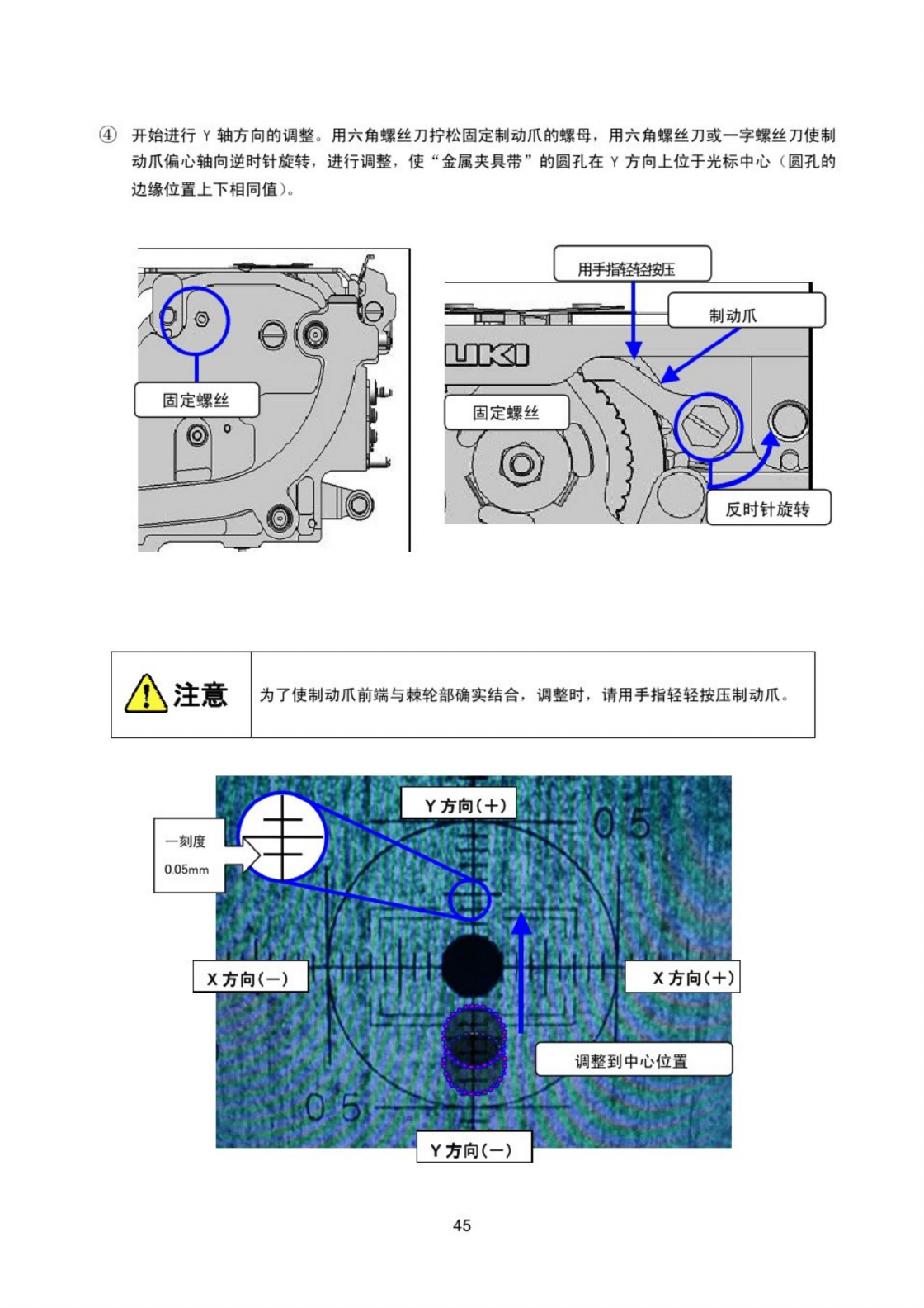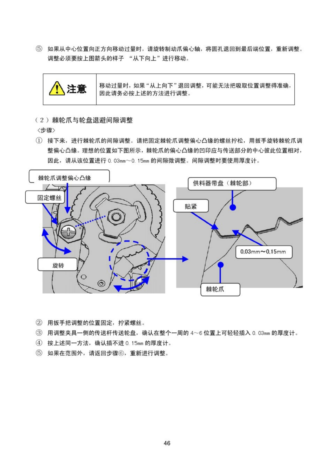 ⑤ 如果从中心位置向正方向移动过 fi 时 , 请旋转制动爪偏心轴 . 将圆孔退回到最后端位置 , 重新调整 。 调整必须要按上图箭头的样子 “ 从下向上 ” 进行移动 。 △ 注意 移动过霣时 , 如果 “ 从上向下 ” 退回调整 , 可能无法把吸取位置调整得准确 . 因此请务必按上述的方法进行调整 , ( 2 ) 棘 轮 爪 与 轮 盘 退 避 间 隙 调 整 〈 步播 〉 ① 接下来 , 进行棘轮爪的间陳调整 。 请把固定棘轮爪调…