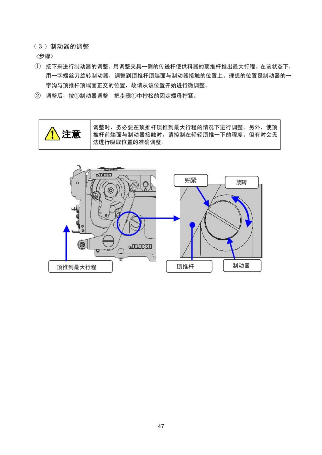 调整到顶推杆顶端面与制动器接触的位置上