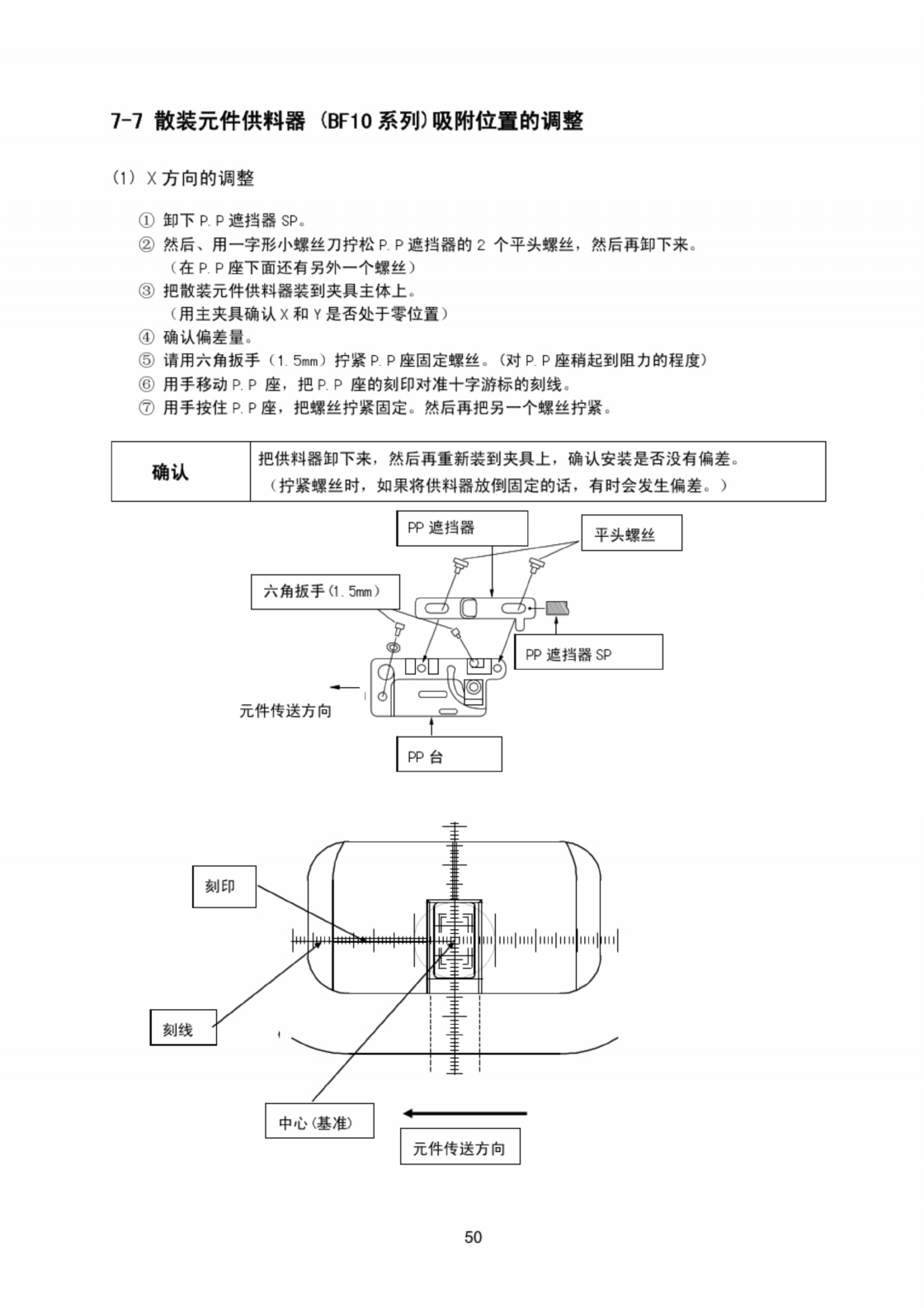 ( 2 ) Y 方向的调整 ① 请用十字螵丝刀拧松螺丝 ( 共 12 个 ) , 然后卸下皮带护罩 皮带护軍 ② 把散装元件供料器装到供料器调整夹具主体上 。 ( 应用主夹具确认 X 和 Y 是否处于零位置 ) ③ 确认偏差量 。 ④ 用螺丝扳子 ( 5.5 mm ) 拧松螺母 ( 临时固定 X ⑤ 用六角扳手 ( 1.5 mm ) 调节螺丝 , 让 P . P 座的刻印对准十字游标的刻线 。 ⑥ 用螺丝板子 ( 5.5 mm ) 固定…