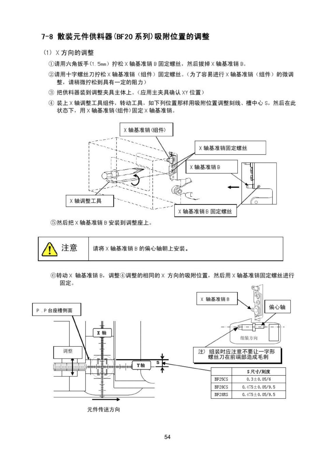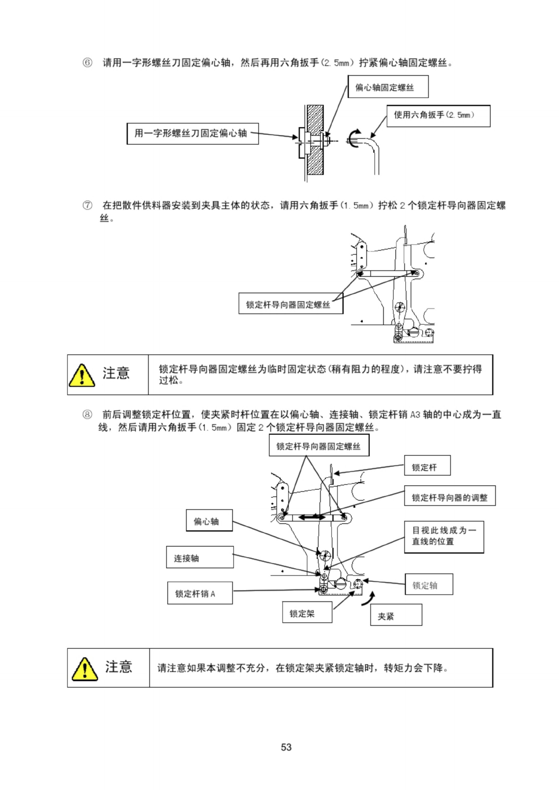 ⑥ 请用一字形螺丝刀固定偏心轴 , 然后再用六角扳手 ( 2 . 5 mm ) 拧紧偏心轴固定螺丝 偏心轴固定螺丝 使用六角扳手 ( 2 . 5 mm ) 用一字形螺丝刀固定偏心轴 ^ J ⑦ 在把散件供料器安装到夹具主体的状态 , 请用六角扳手 ( 1.5 mm ) 拧松 2 个锁定杆导向器固定螺 丝 。 锁定杆导向器固定螺丝 A 注意 锁定杆导向器固定螺丝为临时固定状态 ( 稍有阻力的程度 ) , 请注意不要拧得 过松 。 ⑧ 前后…