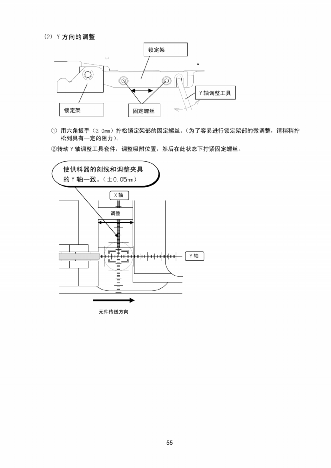 ( 2 ) Y 方向的调整 锁定架 II 1 Y 轴调整工具 锁定架 固定螺丝 ① 用六角扳手 ( 3.0 _ ) 拧松锁定架部的固定螵丝 。 ( 为了容易进行锁定架部的微调整 . 请稍稍拧 松到具有一定的阻力 ) 。 ② 转动 Y 轴调整工具套件 , 调整吸附位 S , 然后在此状态下拧紧固定螺丝 。 ) C 使供料器的刻线和调整夹具 的 Y 轴一致 。 ( 土 O . O & rni ) LZ ^ J 1 调整 Iiii |…