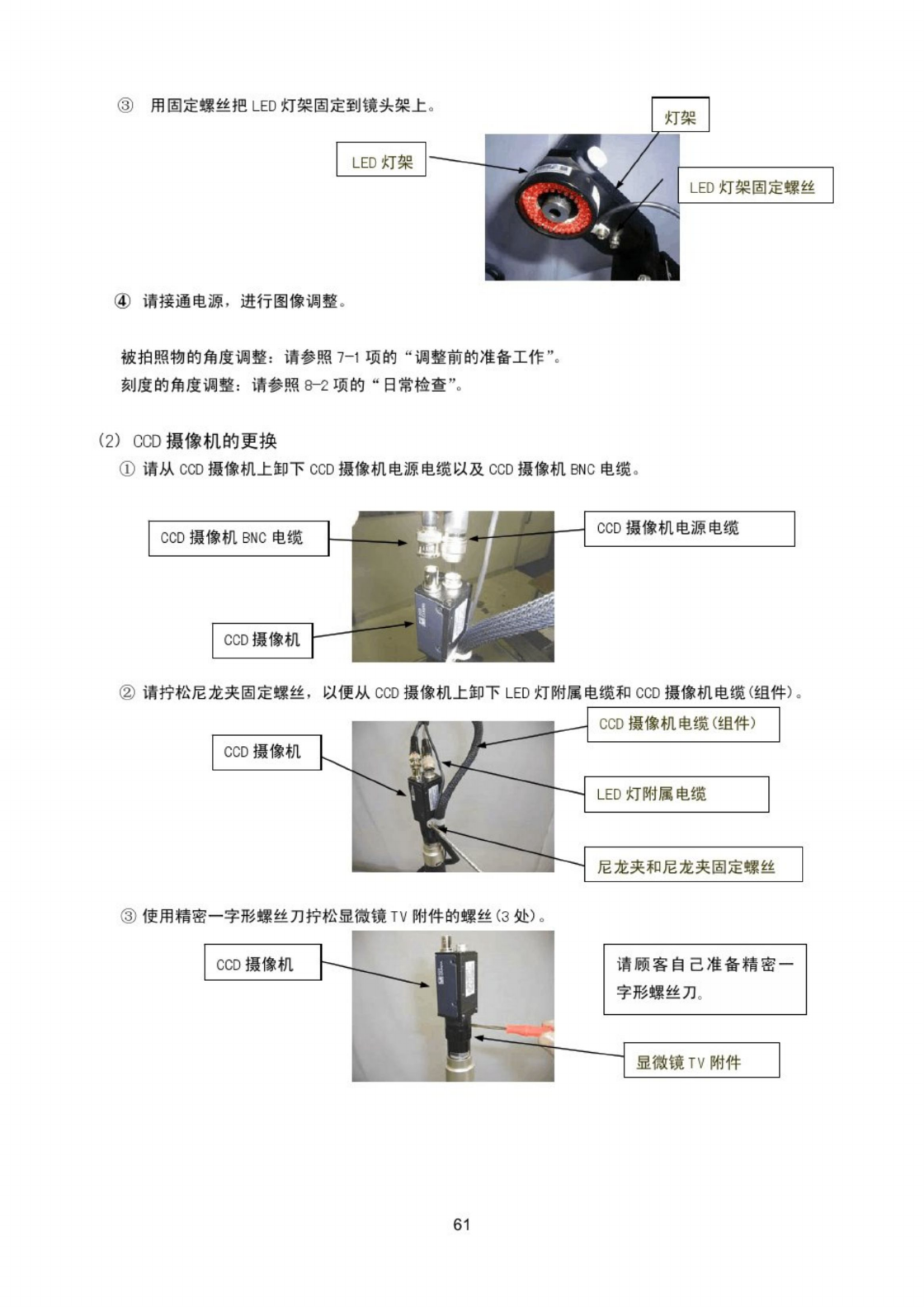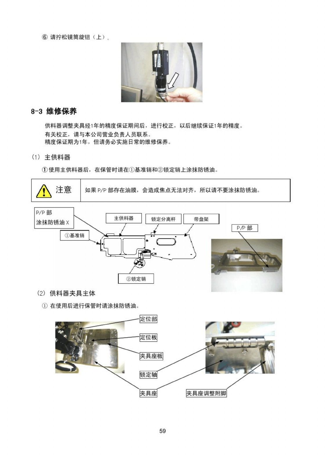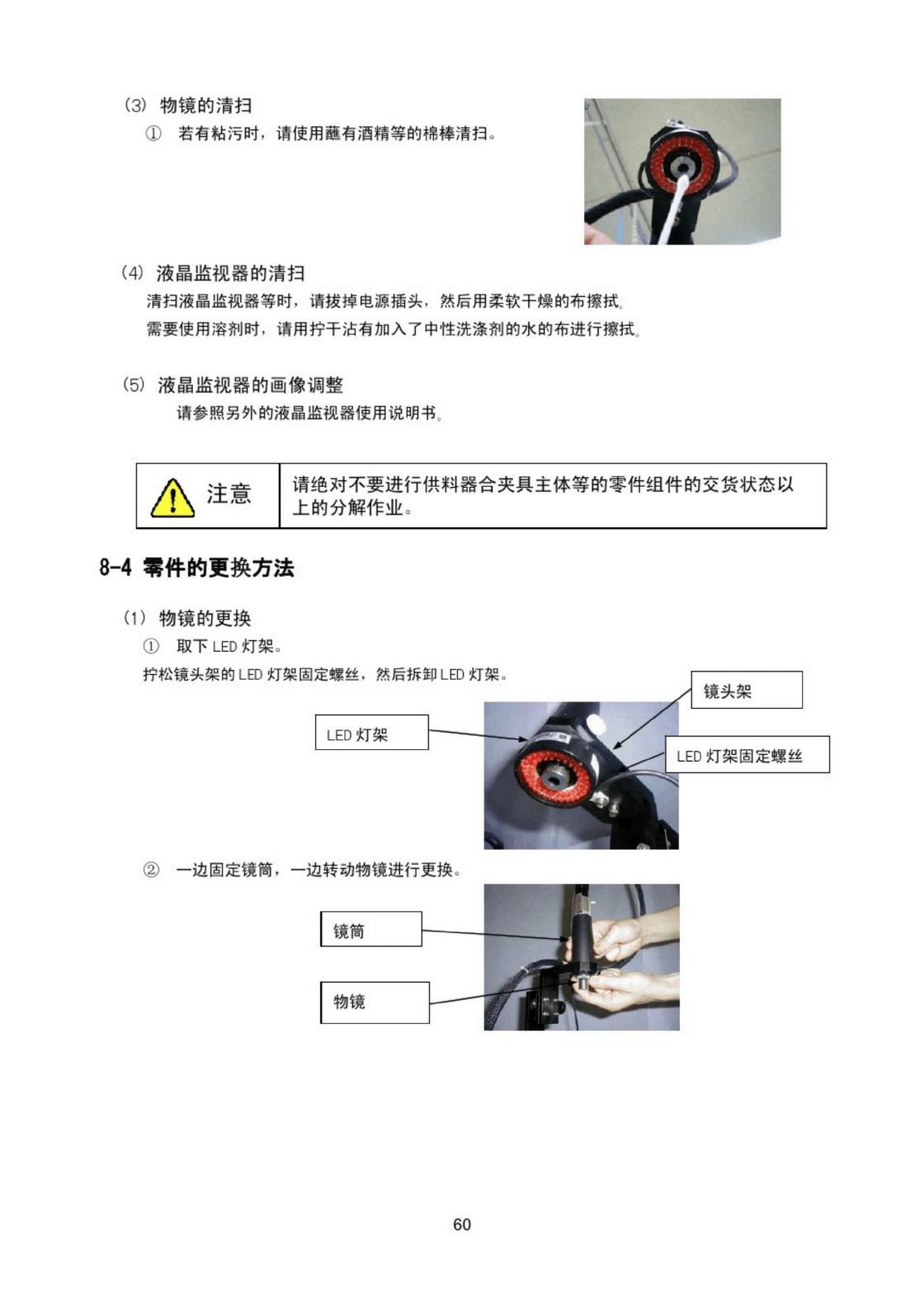 ( 3 ) 物镜的清扫 ① 若有粘污时 , 请使用醒有酒精等的棉棒清扫 。 ( 4 ) 液晶监视器的清扫 清扫液晶监视器等时 . 请拔掉电源插头 , 然后用柔软干燥的布擦拭 需要使用溶剂时 , 请用拧干沾有加入了中性洗涤剂的水的布进行揀拭 ( 5 ) 液晶监视器的画像调整 请参照另外的液晶监视器使用说明书 . . 请绝对不要进行供料器合夹具主体等的零件组件的交货状态以 上的分解作业 。 注意 8 - 4 零件的更换方法 ( 1 ) 物镜…