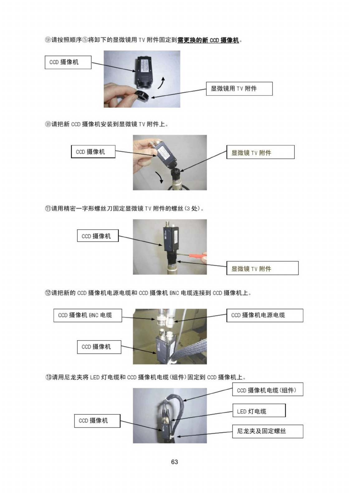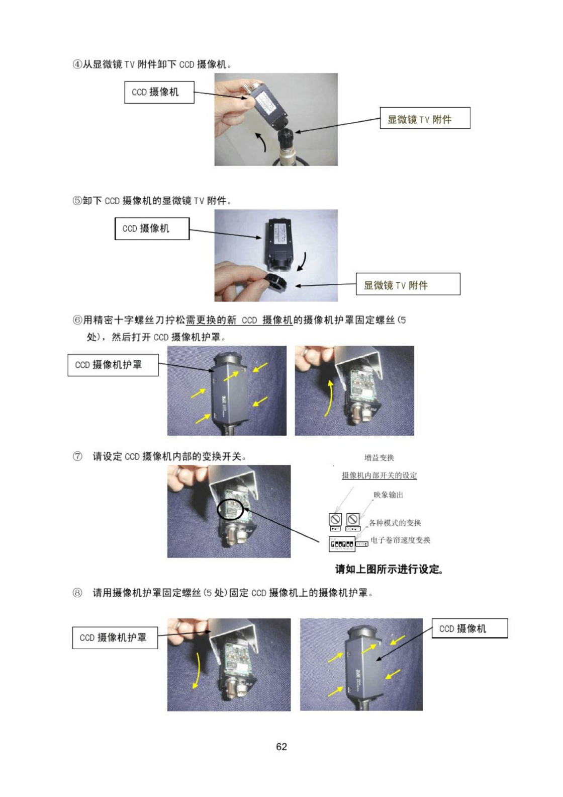 ④ 从显微镜 TV 附件卸下 CCD 摄像机 。 CCD 摄像机 显微镜 TV 附件 ⑤ 卸下 CCD 摄像机的显微镜 TV 附件 , CCD 摄像机 — — 显微镜 TV 附件 ⑥ 用精密十字螺丝刀拧松需更换的新 CCD 摄像机的摄像机护罩固定螺丝 ( 5 处 ) , 然后打开 CCD 摄像机护罩 。 CCD 摄像机护罩 ⑦ 请 设 定 CCD 摄像机内部的变换开关 。 增益变换 摄像机内部 jr 关的设定 映象輪出 11 种換式…