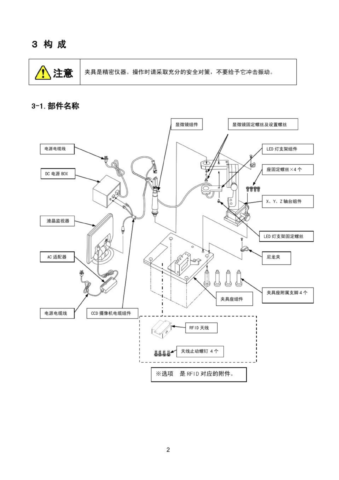 3 构 成 ^ 注意 夹具是精密仪器 。 操作时请采取充分的安全对策 , 不要给予它冲击振动 。 3 - 1 . 部件名称 显微镜组件 显微镜固定螺丝及设置螺丝 电源电缆线 LED 灯支架组件 座固定螺丝 X 4 个 DC 电源 BOX X 、 Y 、 Z 轴台组件 液晶监视器 LED 灯支架固定螺丝 AC 适配器 尼龙夹 夹具座附展支脚 4 个 夹具座组件 电源电缆线 CCD 摄像机电缆组件 r RFID 天线 r 天线止动螺钉 4 …