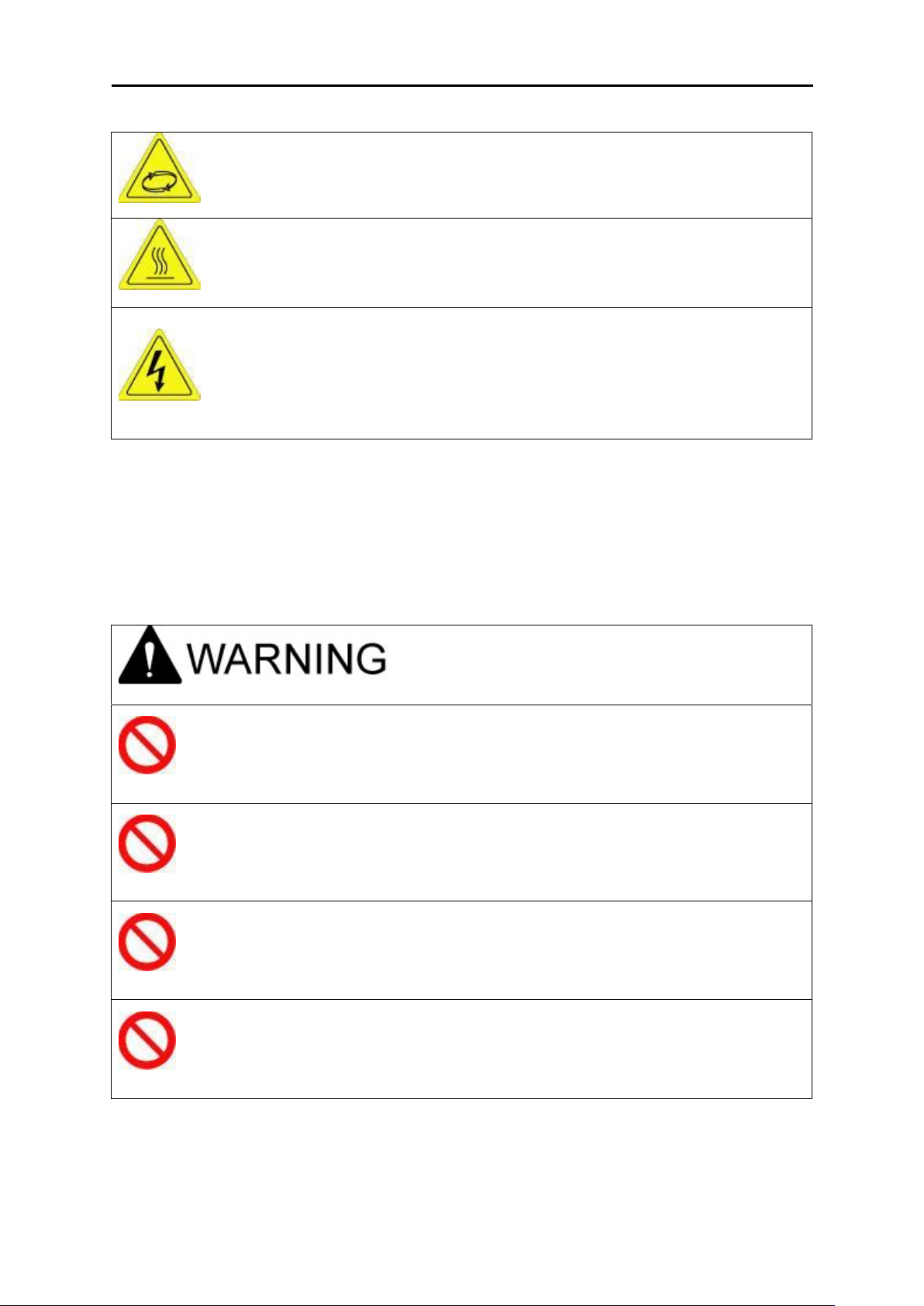 1. 介绍 1.4. 安全注意事 项 此标记为设备运行当中 身体局部避免触碰 . 关闭电源后进行作业 此标记为设备运行当中 身体局部部位避免触 碰会有烧伤危险 . 此标记为高电压导致人 员受伤 . 有此标记的地方禁止触 碰或放到周边有其他 物体的地方 详细的注意事项内容在 标记的周边 . General warni ng 禁止使用高于或低于标 准电压 会引起火灾或电击的危 险 使用电源插头时注意衣 物的袖口 会引起火灾或电击的危 险 .…
