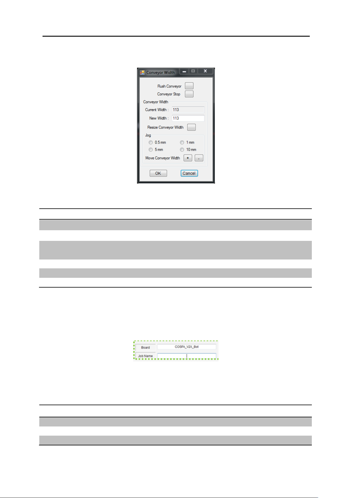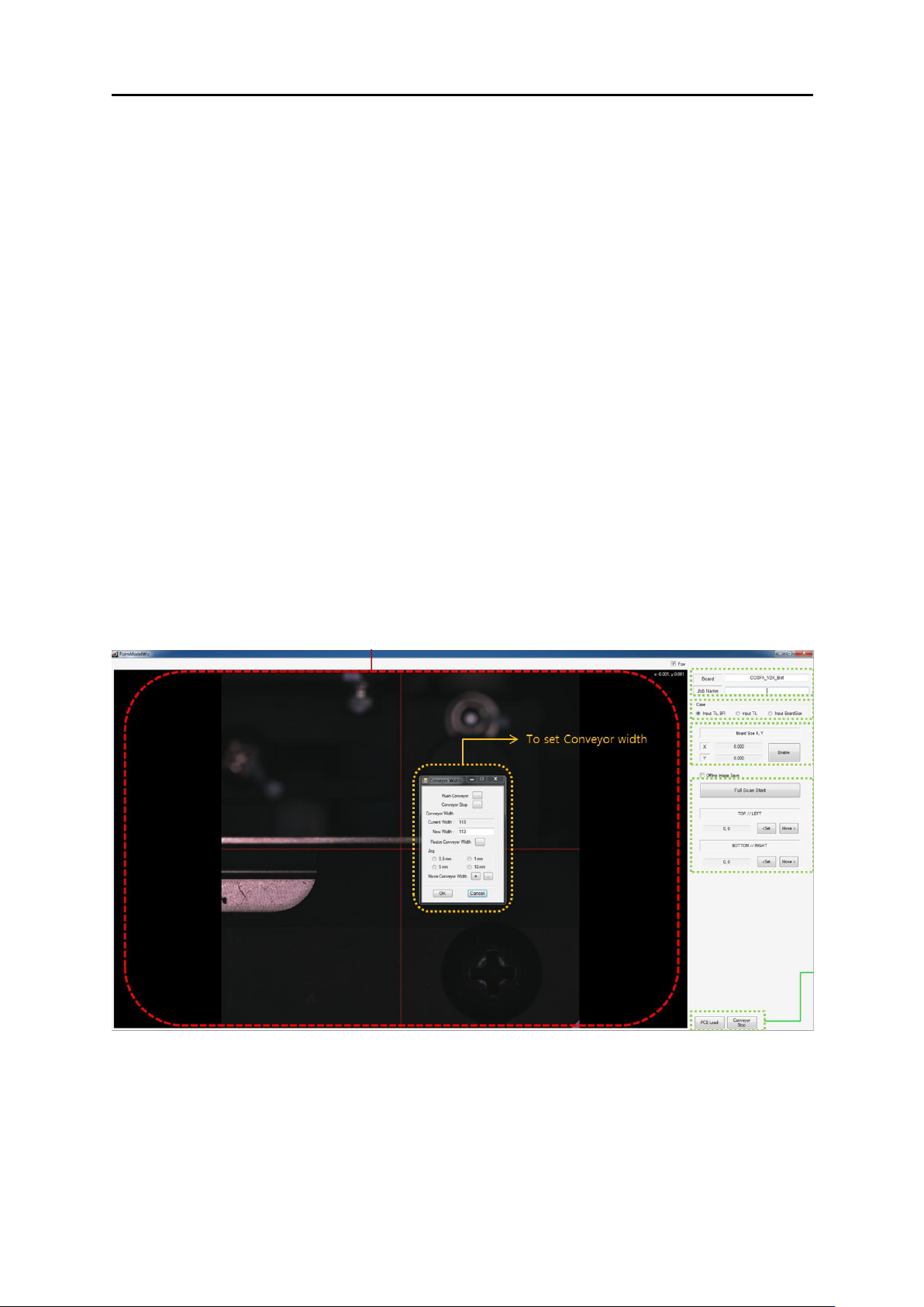 5 . 教学 5.1. 新程 序生成 根据 PCB 的 宽 度 进 行 轨 道 宽 度 调 整 动 作。 轨 道 宽 度 调 整窗口 名称 功能 备注 Flush Conveyor 排出工作台 内 的 PCB Conveyor S top 轨 道 运转 停止 Current Width 现 在 轨 道 宽 度 如有作 业员进 行了手 动设 置 将 丌一 致。 New Width 需要 调 整的 轨 道 宽 度 Res ize Conve…