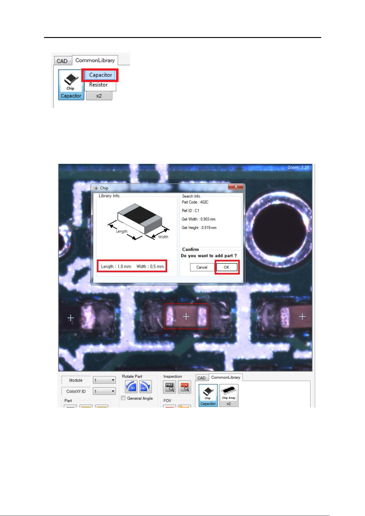 6. SPC 5.4.3. 2 用 Common L ibrar y 添加 P art - 用 鼠标勾画需要添加的 元件会弹出如下窗 口 . - 显示 CAD 信息及尺寸信息 .Common Librar y 里登记 的 Part 中尺寸最接近 的 Part 自动生成 . - <OK> 点击 P ar t 添加窗口设定的 T ype 对应 生成算法 .