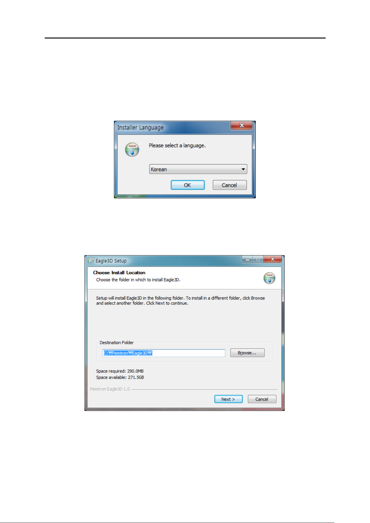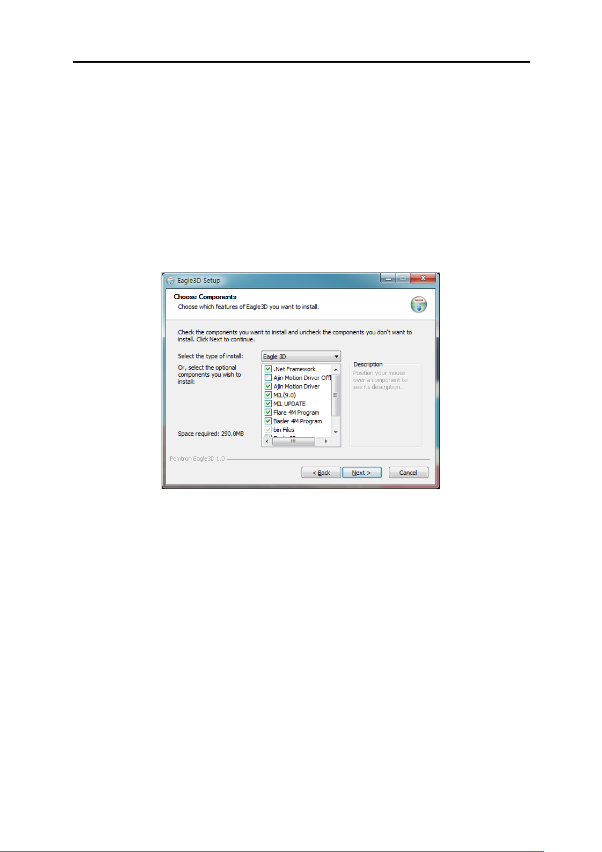 8. Installation 8.1. PC 설치 4) 选择性安装主界面 . ① 安装种类 设备安装和 Off -Line 二种模 式 . 需要安装到设备 PC 选择 „ Ea gle 3D ‟ (默认) 本章针对 „ Eagle 3D ‟ 安装为准 . ② 选择性安装 选择需要安装的软件 . 通过鼠标点击方框进行 安装或取消安装对应 的软件 .