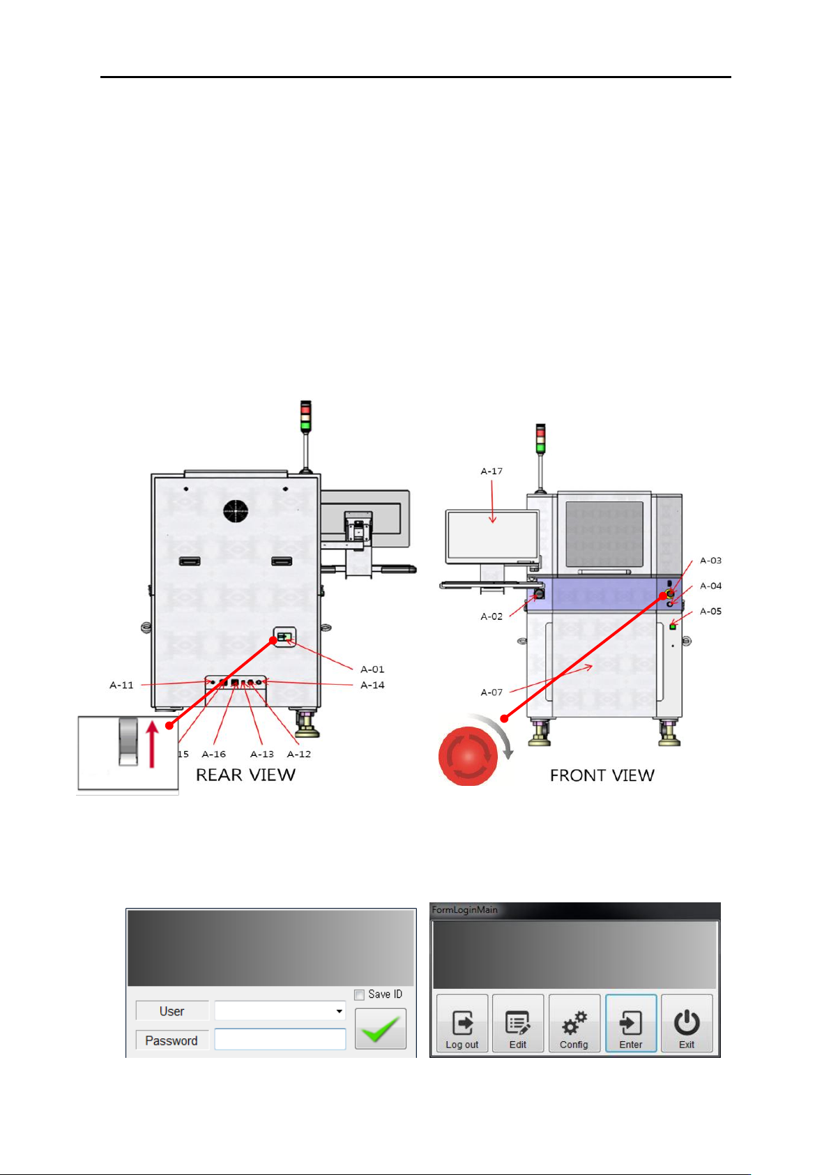 2. 设备构造 2.2. 开始 & 结束 2.2. 开始 & 结束 本章介绍开始及结束的 使用说明 . 2.2.1. 设备开始 设备开始按以下方式进 行 . A. 开启设备背面的开关后 正面的电源开关顺 时针方向 90 度开启 . 提前确 认轨道内 P CB 位置是否在危险的 位置 . B. PC 会跟设备主电源一 起开启 . 确认 L CD 显示 器显示 PC 即可 . 软件运行后输入 用户 ID 及密码 . <…
