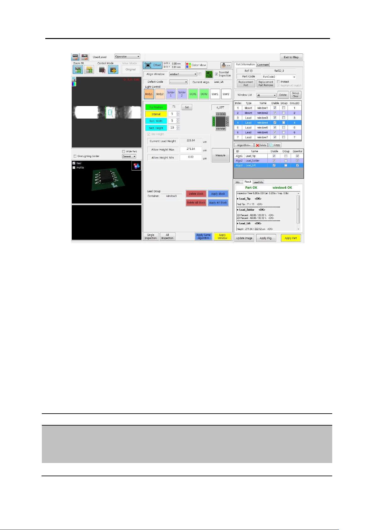 3 . 检测软 件构造 3.4. 使用者环境 Fit Image 对 准 窗口 Gap Solder 检测区 域 设 定 Pixl T each 确 认 所 设 定 参数 View Option : Option 设 定 类 型 说 明 Lead Lead 有无 检测 . Bridge Bridge 检测 LIFT Lead 脚 翘检测 Solder Solder 锡 量 检测 Bridge Option : B ridge 选 项设 …