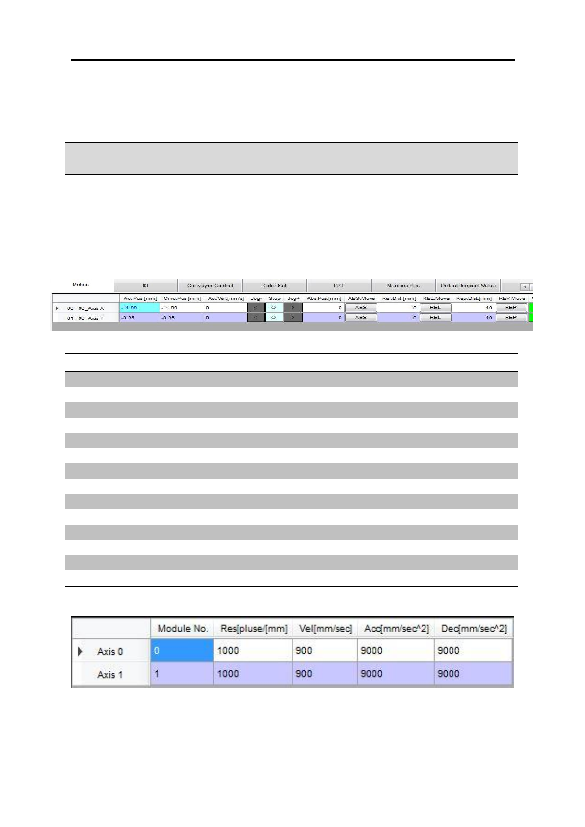 软件构造 3.4. 使用 者环境 3.4.6.2. 马达设 定 <(Motion)> 选择 注意 请 注意安全提示 . 没 有 复 位情 况 下所移 动 位置有可能丌 一致。 没 事 设 定 软 件 极 限位置 , 请 注意撞 击 危 险 。 Jog 移 动时 速度 过 快 将会导 致撞 击 危 险 。 功能 使用方法 说 明 轴 选择 列表中第一列 选择 选择所需设定的轴 Act. P os. 显 示 轴 的 实际 位置 …