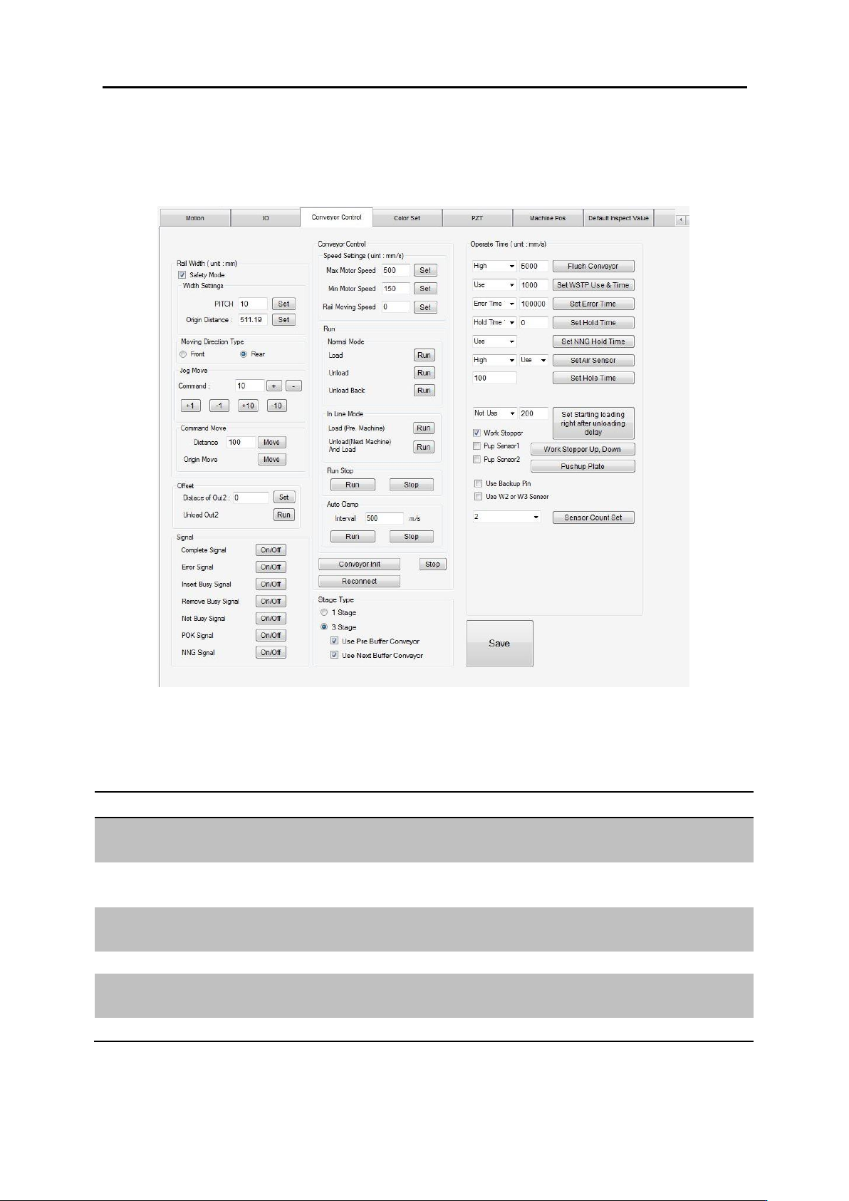 软件构造 3.4. 使用 者环境 B. (Signal) 功能 使用方法 说 明 Complete <On/Off> 选择 轨 道 运转 完成信 号 Error <On/Off> 选择 轨 道失 败 Insert Busy <On/Off> 选择 PCB Load 进 板信 号 Remove Bus y <On/Off> 选择 PCB Unload 出板信 号 Not Busy <O…