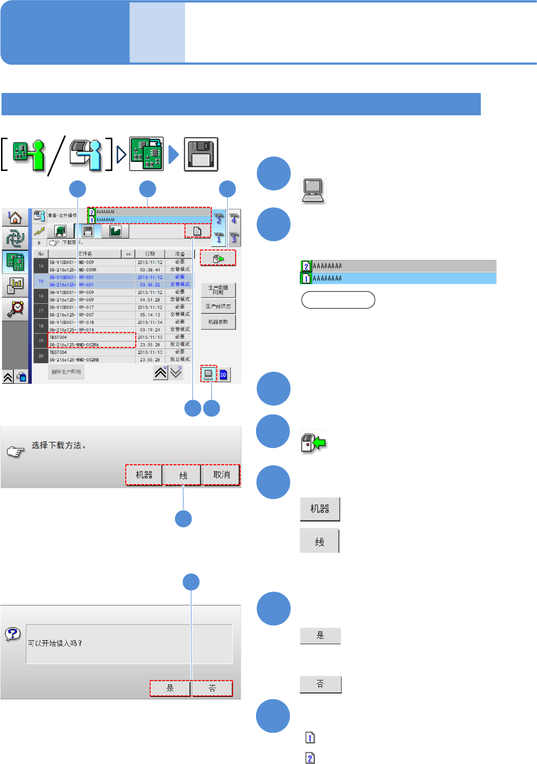 NPM - DX EJM8D C - MB - 03O - 00 文件 操作 生产数据 的读入 2 经由 LNB 从 DGS 传输到设备 / 双轨模式 1 2 3 选择读取处 3-1-3 -3 5 选择文件 6 3 4 操作 手册 3 - 1 - 3 2 4 7 7 1 注意 ● 当只在单侧进行生产 时,请 只读取 单侧的生产数据 。 ● 不能在轨道 1 、轨道 2 上同时读取交 互 交互实装模式和 独立实装模式 。 选择文件读入的来源…