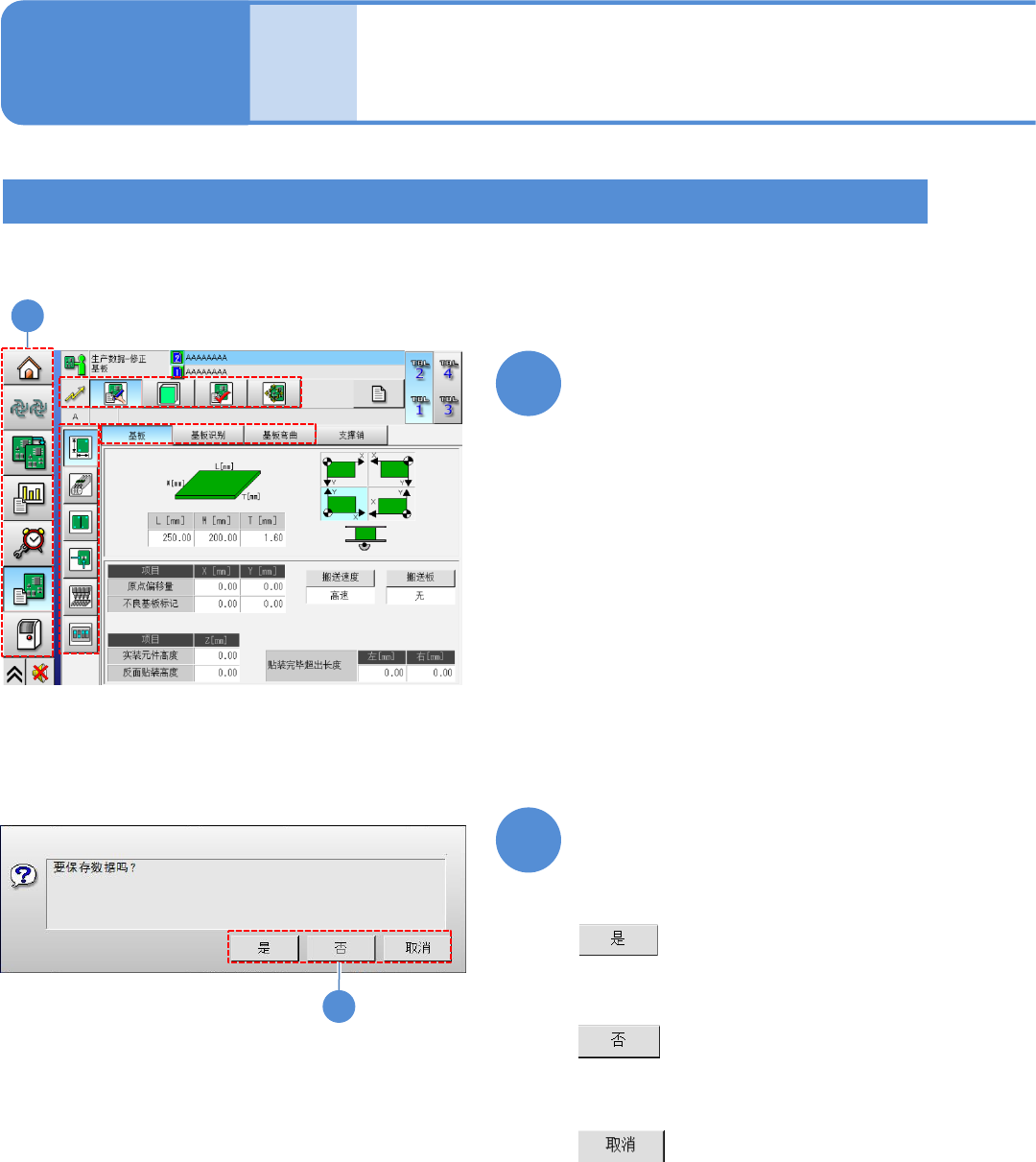 NPM - DX EJM8D C - MB - 03O - 00 文件 操作 生产数据的保 存 经由 LNB 从设备保存 到 DGS 2 操作 手册 3 - 1 - 4 1 1 修正生产数据后,转到其他画面 3-1-4 -1 会显示是否要保存数据的提示 信息 ■ 不保存数据时 ■要取消画面的 切换时 ( 此时,会停留在原来 的画面 ,数据没 有被保存 ) 2 ■要保存数据时 从 LNB 读入 到设 备的生产数 据,在设备修改数据 后经由…