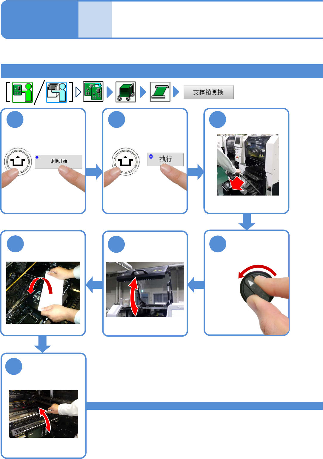 NPM - DX EJM8D C - MB - 03O - 00 个别 准备 支撑销 ( 整体更换用 ) 的 安装 1 3-3-8 -1 操作 手册 3 - 3 - 8 1 卸下基板 2 3 支撑销 ( 整体更换用 ) 的安装 1 5 4 7 用棉纱布盖在多功 能识别照相机上 6 卸下更换台车 ( → P.2 - 4) ACTIVAT IO N ACTIVATI ON 将供料器工作台盖 倒向内侧 OFF SERVO ON