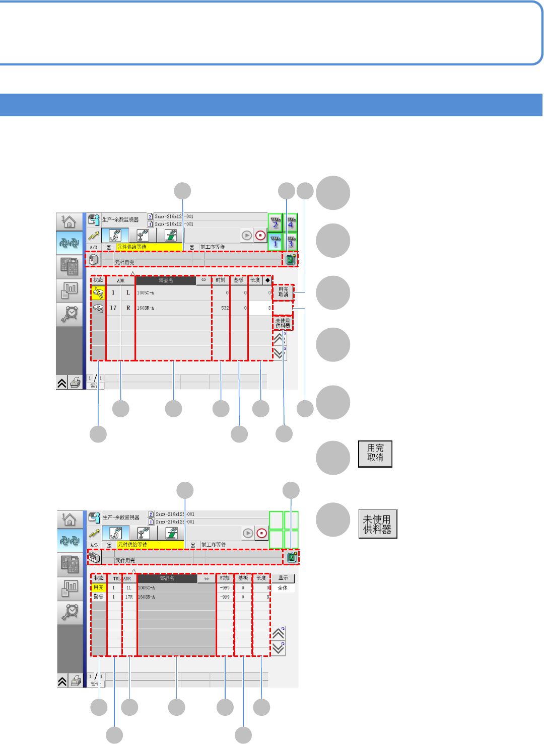 NPM - DX EJM8D C - MB - 04O - 00 元件的余数 ● 生产中,以 设备单位或者生产 线单位显示元 件的余数。 1 生产中、停止 中的 确认方法 3 4-2-1 -5 生产 信息 1 : 设备单位 : 生产线单位 A B C 状态 ■ 供料器的元 件用完,但是拥有 存储 ■ 供料器的元 件用完,且没有存 储时 供料器 : 白色 背景 : 灰色 操作 手册 4 - 2 - 1 供料器 : 白色 背景 : 灰色 、…