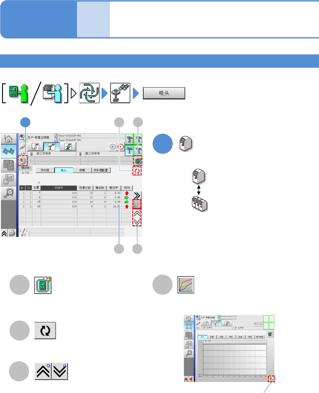 NPM - DX EJM8D C - MB - 04O - 00 贴装头的吸着状况 生产中、停止 中的 确认方法 5 4-2-1 -9 B D 生产 信息 A 生产中的基板在生产 后,再 停止生 产 。 ( → 『 操作手册 』 P.4 -1- 3) C A B D C 1 1 操作 手册 4 - 2 - 1 ● 所选择的吸嘴在 1 小时左右的错 误次 数通过图表来显 示。 竖轴 : 错误次数 横轴 : 时间 返回 原来画面时 选择设备…