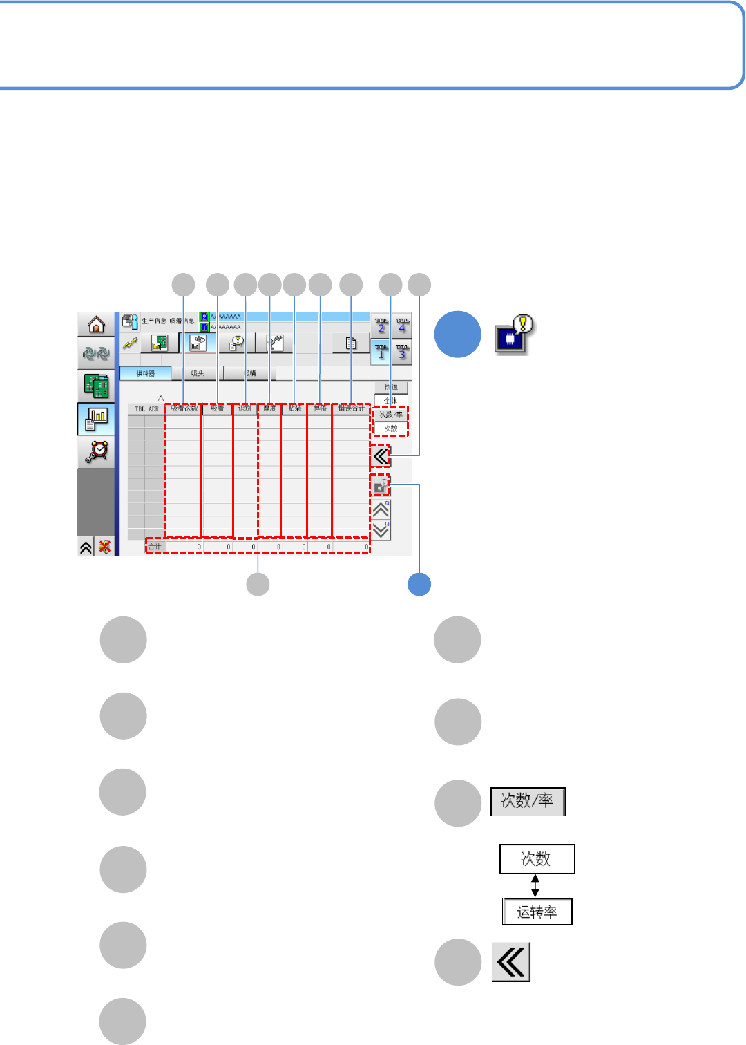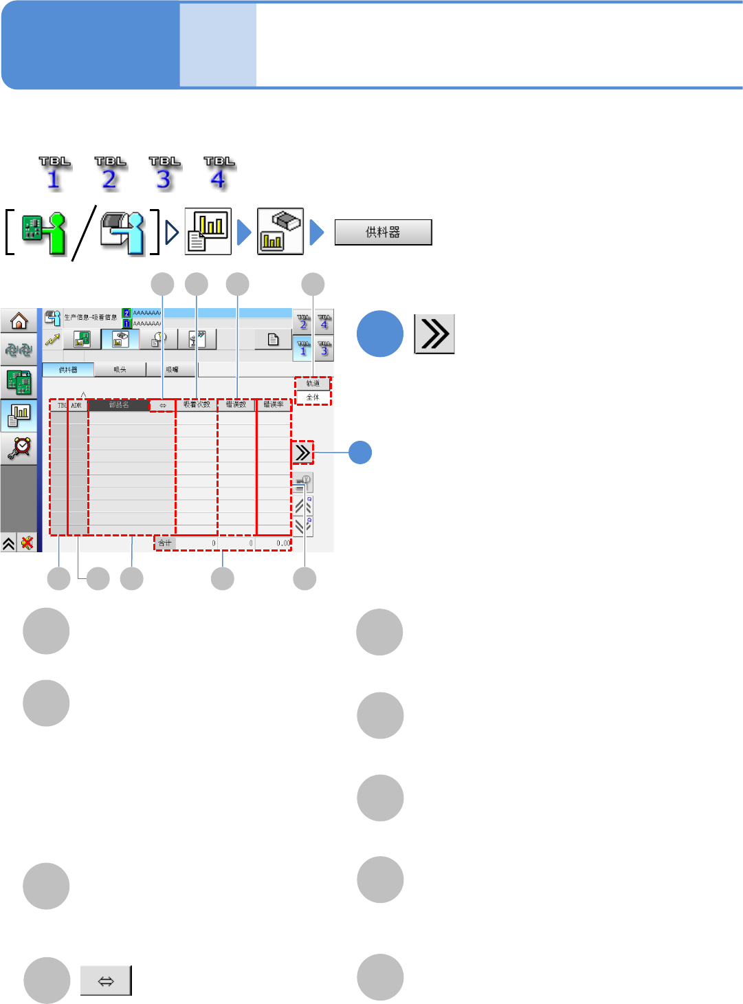 NPM - DX EJM8D C - MB - 04O - 00 4-2-3 -1 C A B D E F G H E F D A C H B 供料器的吸着信息 1 1 G I I 生产 信息 操作 手册 4 - 2 - 3 1 ● 请全都实施 。 可以确认各供料 器地址的元件 信息。 ( 显示错误的详细信息 ) T B L ( 工作台 ) 所参照的工作台 。 ADR ( 地址 ) 供料器地址。 部品名 吸着 的元件名称。 ●数字 : …