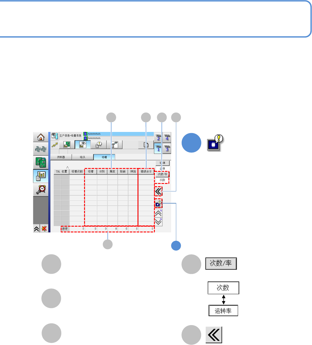 NPM - DX EJM8D C - MB - 04O - 00 4-2-5 -1 吸嘴的吸着信息 1 D H G 1 C A B A C B E F I D E F G H I 生产 信息 操作 手册 4 - 2 - 5 1 ● 请全都实施 。 可以确认各吸嘴 的元件吸着信 息。 显示前后画面。 合计 所有供料器的吸 着次数和错误 次数的合计, 以及相对总吸着 次数所发生错 误的比率。 错误率 相对吸着次数所 发生错误的比 率。 轨道…