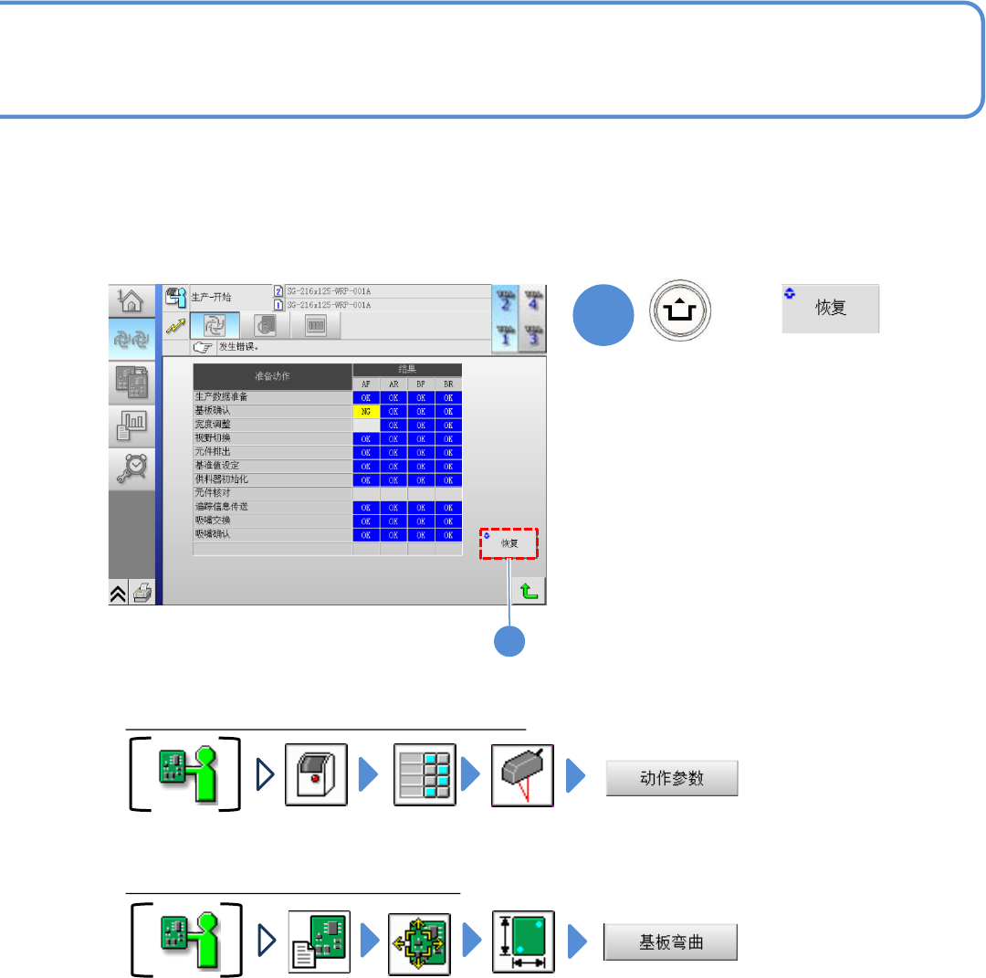 NPM - DX EJM8D C - MB - 04O - 00 应对处理方法 ③ 变更基板弯曲倾斜容许值 4-2- 12 -4 变更动作参数“ 基板弯曲倾斜 容许值”的设 定 ( → 『 工程师手册 』 13 -1- 2 ‘ 动作参数的设定 ’) 实施 示教 ( → 『 工程师手册 』 12 -1- 4 ‘ 基板弯曲计测点数据 ’) 8 + ( 开始生产 ) ● 完成了基板抽取作业 。 8 应对处理方法 ④ 基板弯曲计测示教