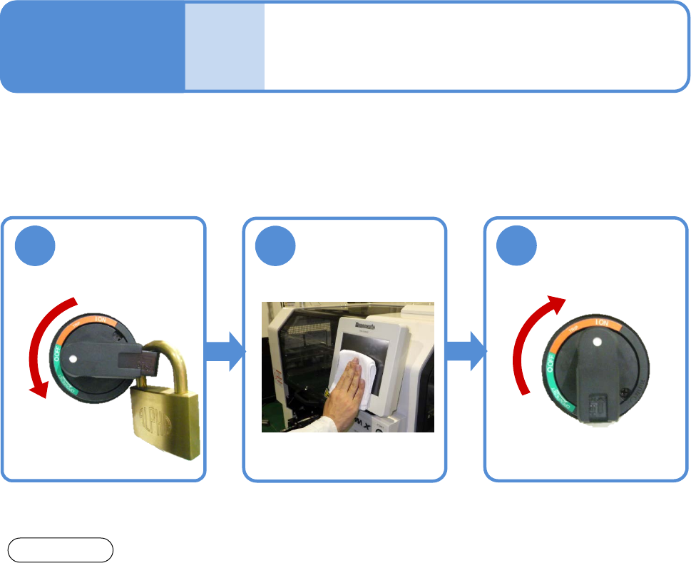 NPM - DX EJM8D C - MB - 07O - 00 7-1 -1 触摸屏的清扫 操作 手册 7 - 1 1 2 3 ON OFF 对触摸屏的清扫 进行说明。 使用工具 : 棉纱布 所需时间 : 3 分钟 ( 前侧和后侧 的合计时间 ) ●如果有灰尘, 会造成错误动 作。请随时进 行清扫。 用干净柔软的棉纱 布等擦拭 注意 ●请勿施加冲击 或使其受损。 ●当灰尘等的附 着严重时,请 用水稀释中性 洗涤剂,然后以棉纱 布沾湿后…