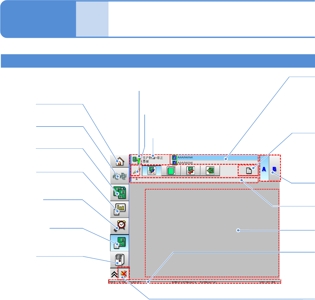 EJM8D C - MB - 02C - 00 NPM - DX 基本 的画面构成 2-2-1 -1 各部位 名称 触摸屏 1 2 - 2 - 1 对触摸屏的各区域显 示内容 进行说 明 。 ( 对前面的触摸屏画面 进行说明 。 ) 模式图标 ● 现在的模式 。 主页 ● 变更操作模式 。 生产 ●自動生産を開始。 生产信息 ●显示来自自 动生产的信息 。 维修保养 ●维护信息的 确认和维护运 作。 生产数据 *1) ●生产数据的 作成…