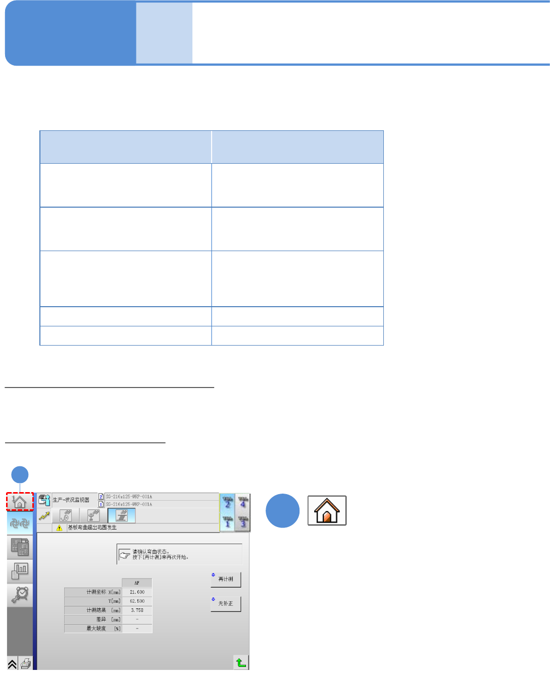 NPM - DX EJM8D C - MB - 04O - 00 4-2- 12 -1 这里对高度传感器 ( 选购件 ) 检测到基板 弯曲错误时的应 对处理方法进 行说明。 基板弯曲检测错误 1 1 ●基板 弯曲导致的 错误有下表 中的 5 种,请根据 错误种类用 以下 4 种方法来操作。 应对处理方法 ① 重新计测基板弯曲形状 返回到主菜单后 ,重新开始生 产 请实施 以下 步骤。 1 生产 信息 操作 手册 4 - 2 - 12 错…