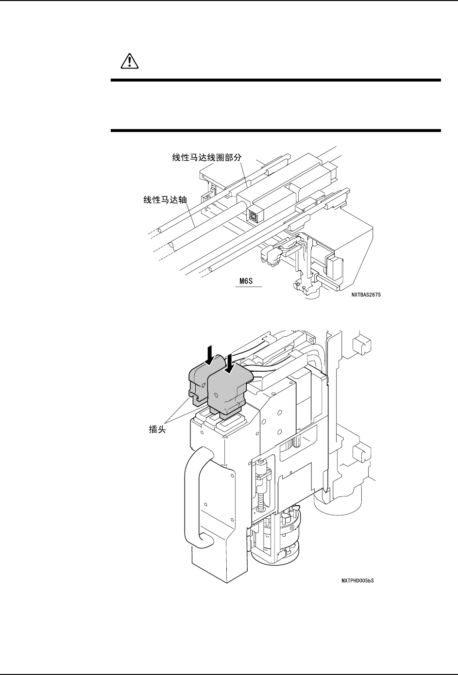5. 基本操作 QD029-09 112 NXT 机械手册 8. 将插头连接到原来的位置上。 备注 ) 安装串行号 No. 不同的贴装工作头后,请在吸嘴平台上安装治具。 详细请参考 「5.7.3 治具吸 嘴的安装」 。 注意 在进行 M6S 操作时,请不要将工作头接近 Y 轴。由于线性马 达会产生磁 力,有可能造成贴装工作头 或者轴的损伤。另外,安装 / 拆除必须请在工 作头的更换位置进行。