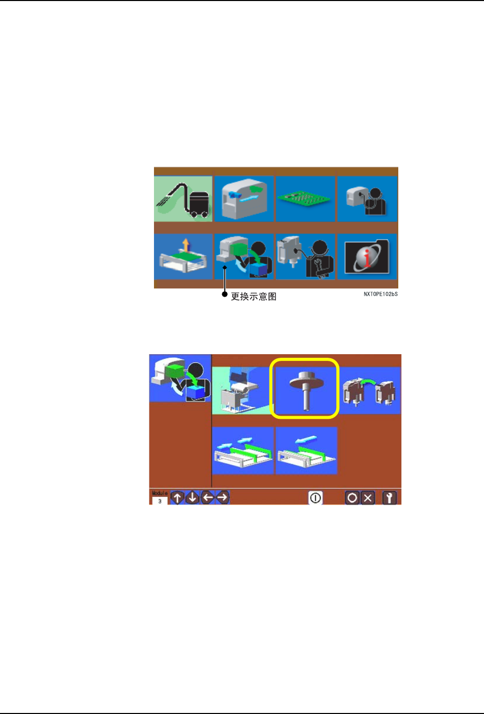 5. 基本操作 QD029-09 116 NXT 机械手册 5.8 吸嘴置放台的拆除 / 安装 吸嘴置放台的种类与搭载的工作 头类型配合使用。 在更换贴装工作头时, 请将吸嘴置放台也 同时更换成相应的类型。 5.8.1 拆除方法 1. 停止模组的运转,使其处于 START 等待状态。 2. 按下操作面板的 「MANUAL」按钮。显示出手动指令 。 3. 按下箭头键,选择更换单元示意图。按 下 「OK」按钮。 4. 请使用箭头键选择更换吸…