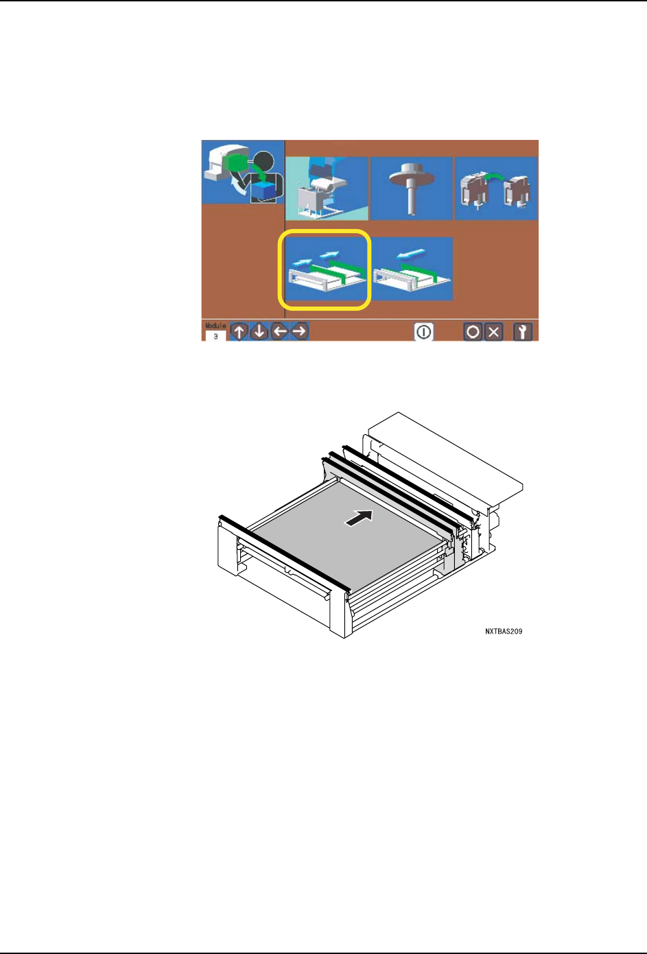 QD029-09 5. 基本操作 NXT 机械手册 125 12.请在通道 1 上安装新的备份板、按下 OK 按键。 13.请插入模组。 a. M3(S) 模组 的时候, 在插入模组 之前, 请确认 XS 轴等的机械 部位是否从模组中 凸出。 凸出的时候,请将模组退回。 b. 握住模组的手柄,直到碰到阻停块为 止慢慢地插入。 c. 模组自动地被拉入后锁定。没有被锁 定时,请稍微拉回一些模组后重新 压入。