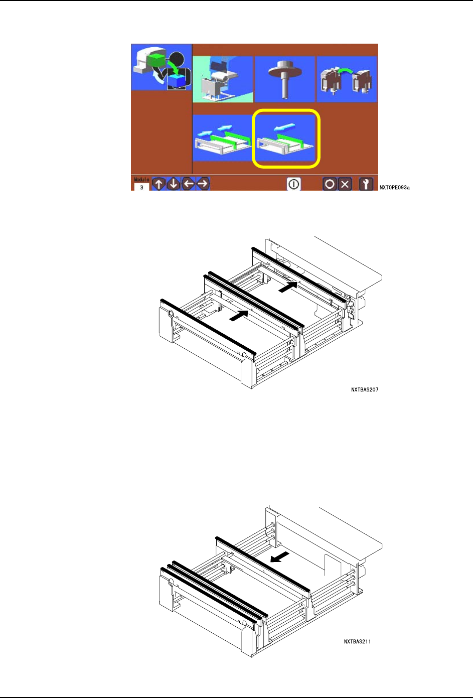 QD029-09 5. 基本操作 NXT 机械手册 127 6. 在操作面板上显示出拆下备份板的向导。 请拆下通道 1 侧的备份板,按下 OK 按键。 7. 请插入模组。 a. M3(S) 模组的时候, 在插入模组前, 请确认 XS 轴等机械部位是否从模组处突出。 突出 的时候,请退让到模组内。 b. 握住模组的手柄,直到碰到阻停块为 止慢慢地插入。 c. 模组自动地被拉入后锁定。没有被锁 定时,请稍微拉回一些模组后重新 压入。 8. …