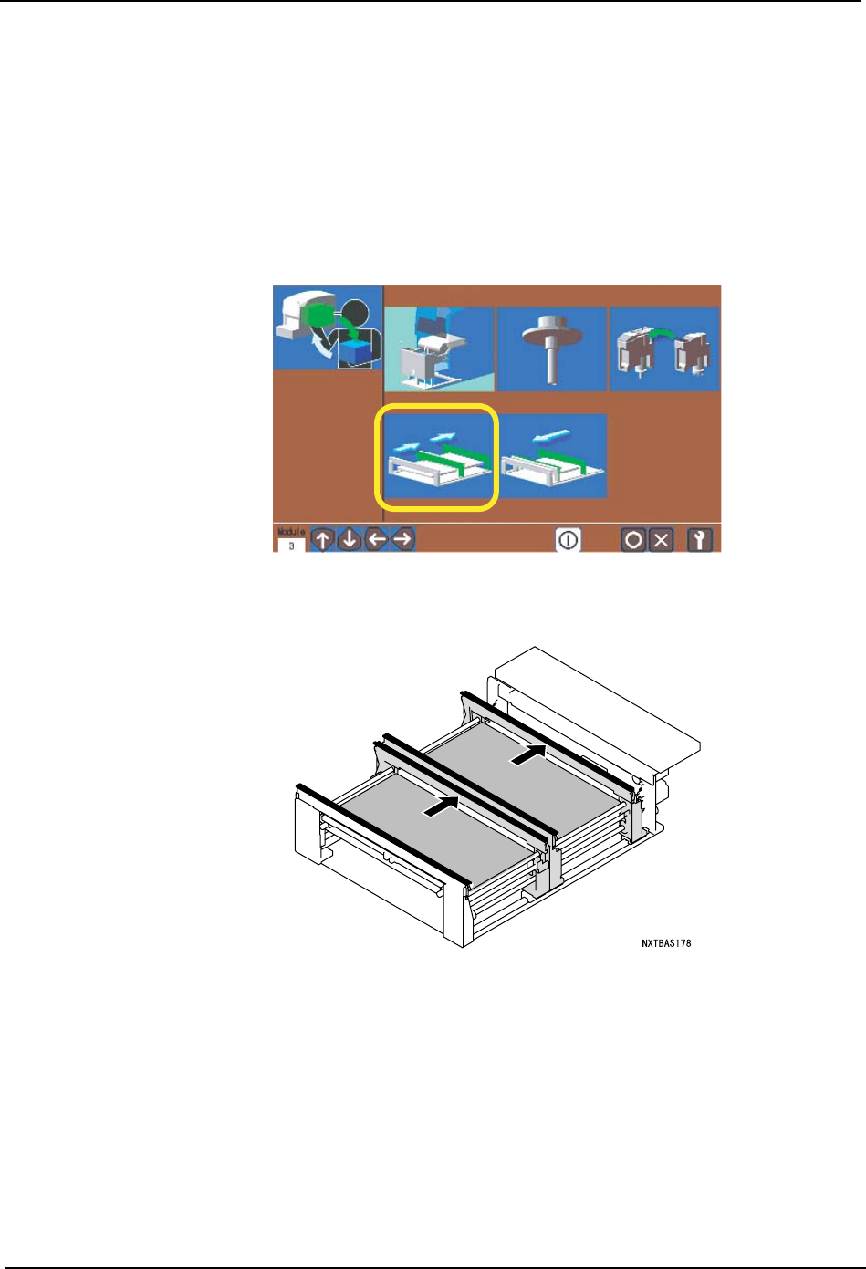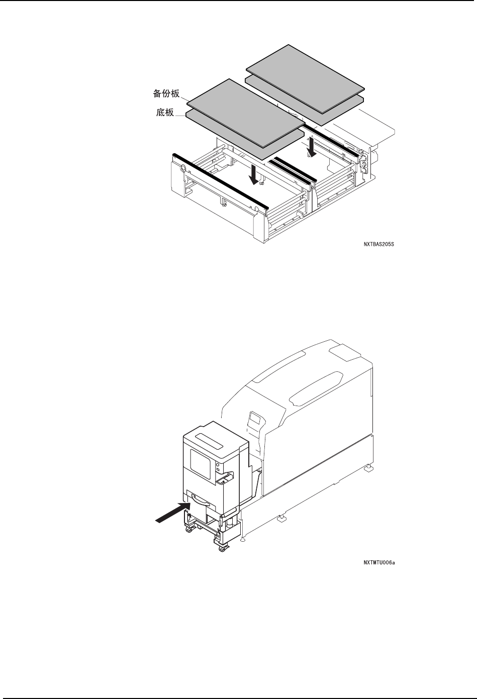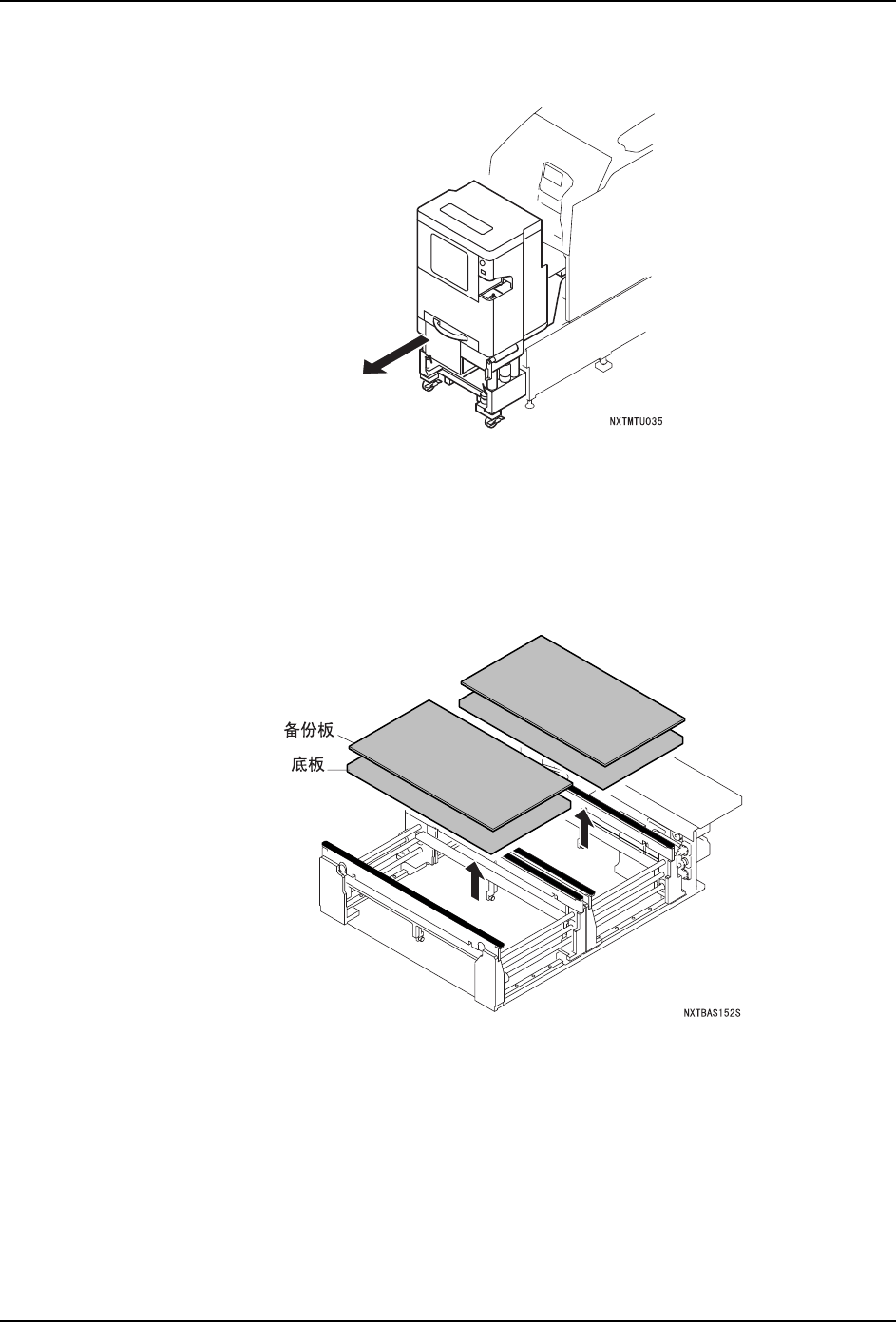 5. 基本操作 QD029-09 136 NXT 机械手册 6. 请拆下料盘单元 -L。解除脚轮的锁定,从 模组中慢慢地拉出料盘单元 -L。结束卸下后, 在操作画面上显示出拉出模组的 向导。 7. 请拉出模组。 a. 请确认模组前侧是否有障碍物后按下 OK 键。 锁定松开, 模组自动地向前方移动一些 。 b. 握住模组的手柄,直到碰到阻停块为止慢 慢地向己方拉出。 8. 在操作面板上显示出拆下备份板的向导 。请拆下通道 1、2 双方的备…
