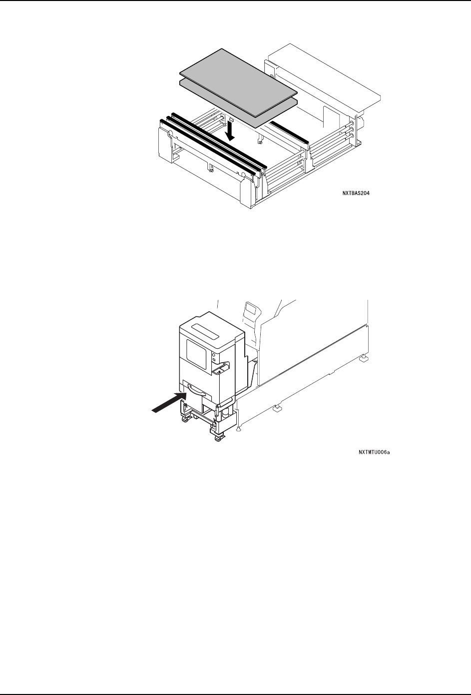 QD029-09 5. 基本操作 NXT 机械手册 149 34.请按下 START 按键。 将搬运轨道扩大 到最大宽度, 在操作画面上 显示出拆除料盘单元 -L 的向导。 35.搬运轨道的移动结 束后,请按下 OK 按键。 36.请拆下料盘单元 -L。拆除结束后,在操作画 面上显示出拉出模组的向导。 37.请拉出模组。 a. 请确认模组前侧是否有障碍物后按下 OK 键。 锁定松开, 模组自动地向前方移动一些 。 b. 握住模组的手柄,…