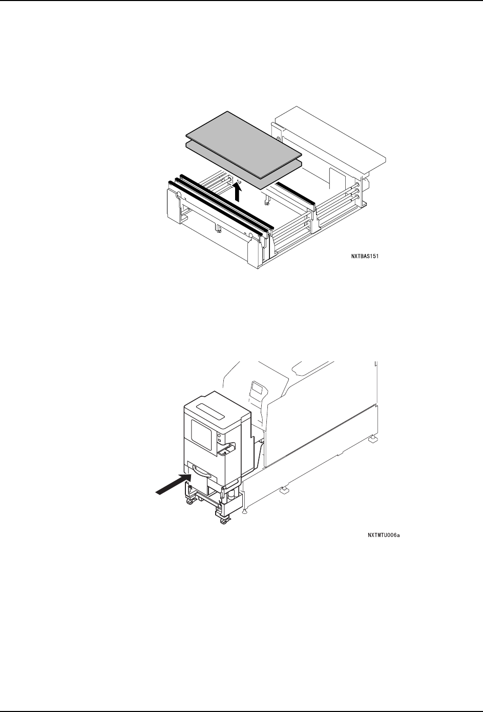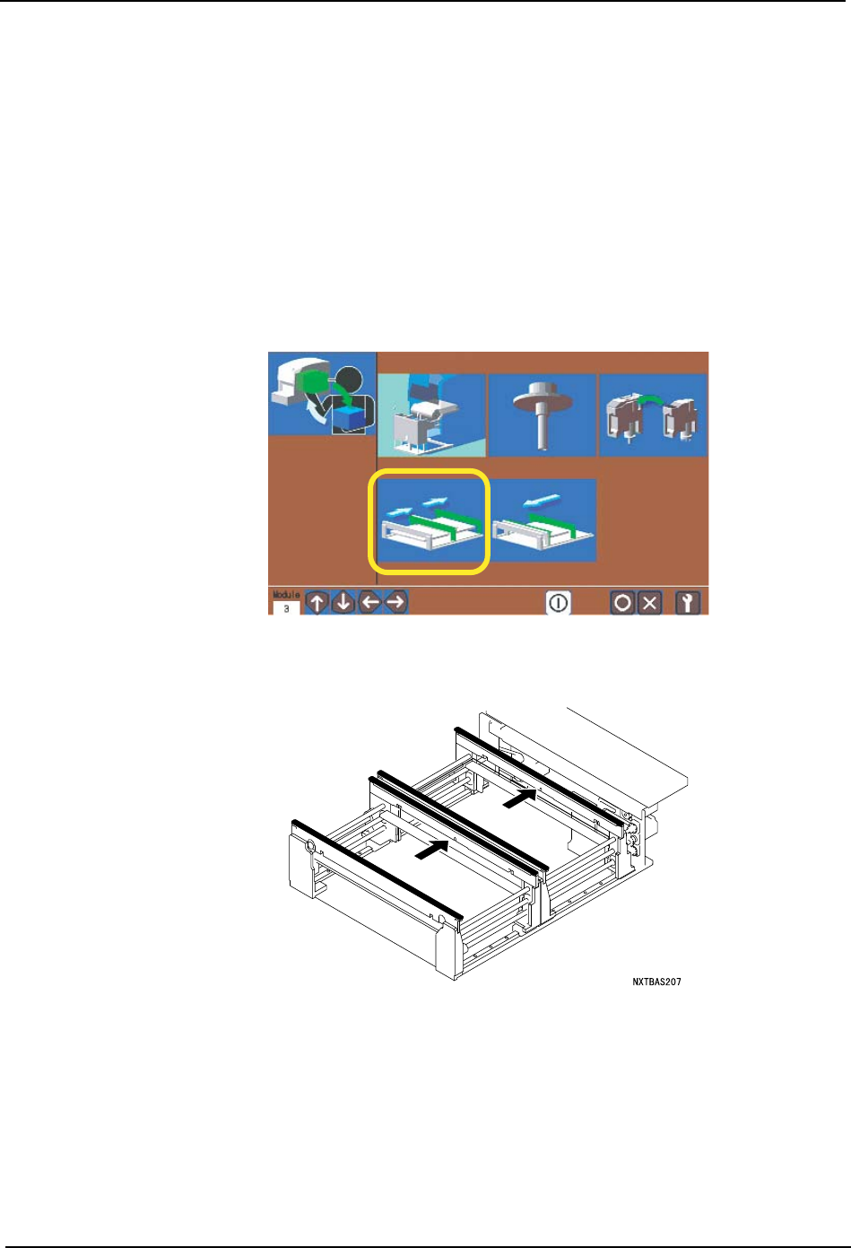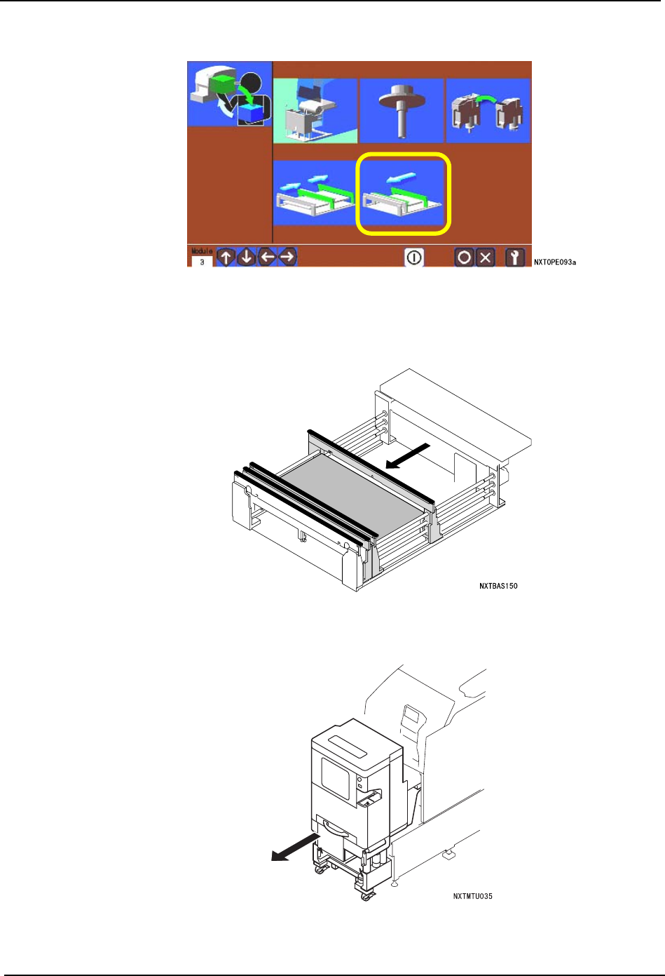 5. 基本操作 QD029-09 154 NXT 机械手册 18.请拉出模组。 a. 请确认模组前侧是否有障碍物后按下 OK 键。 锁定松开, 模组自动地向前方移动一些 。 b. 握住模组的手柄,直到碰到阻停块为止慢 慢地向己方拉出。 19.在操作画面上显 示出拆下备份板的向导。请拆下通道 2 侧的备份板,按下 OK 按键。 20.请插入模组。 a. 握住模组的手柄,直到碰到阻停块为止慢 慢地插入。 b. 模组自动地被拉入后锁定。没有被…