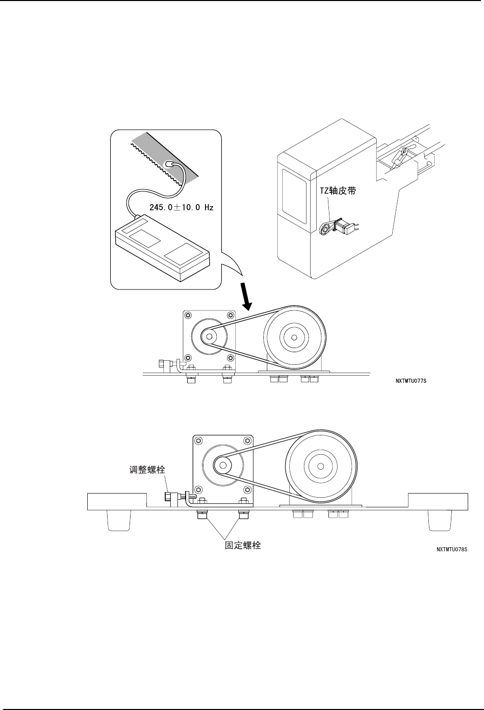 1. 请测定皮带的张力。确认在跨距最长的皮带中央的测定值是 245.0 ± 10.0Hz。