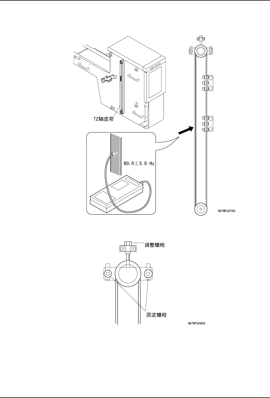 1. 请测定皮带的张力。确认在跨距最长的皮带中央的测定值是 60.0 ± 3.0Hz。
