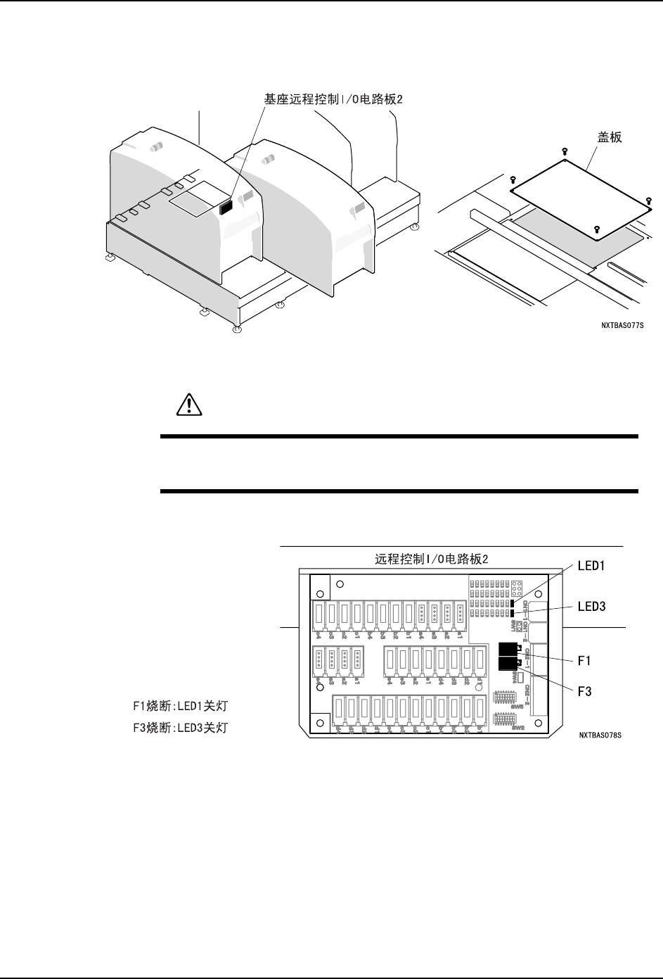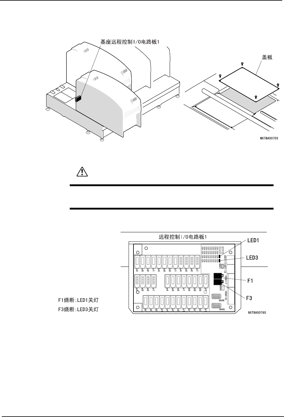 QD029-09 7. 消耗品的更换 NXT 机械手册 267 7.10.1 远程控制 I/O 电路板 1 (8M 基座 ) 1. 拆下远程控制 I/O 电路板上方的盖板。 2. 确认烧断的保险丝是哪一根后,将主电源 开关 OFF 后切断机器的电源。 3. 从远 程控制 I/O 电路板 上拔下保险丝 (F1, F3) 并 更换。 注意 在更换保险丝前,请务必切断 电源。请用与拆下的保险丝相同容 量的保险 丝更换。