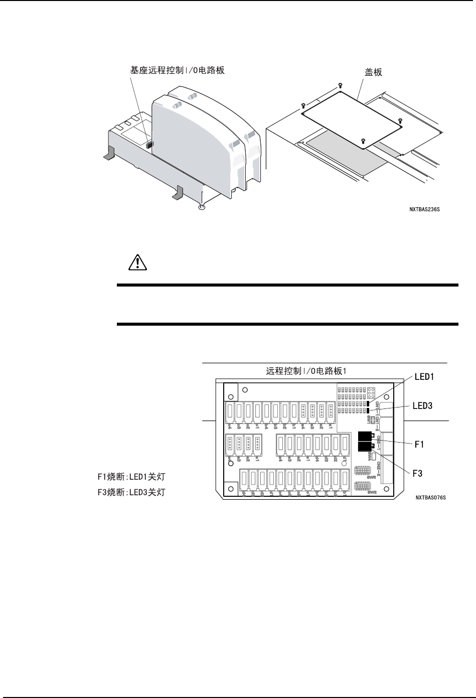 3. 从远程控制 I/O 电路板上拔下保险丝 (F1, F3) 并更换。
