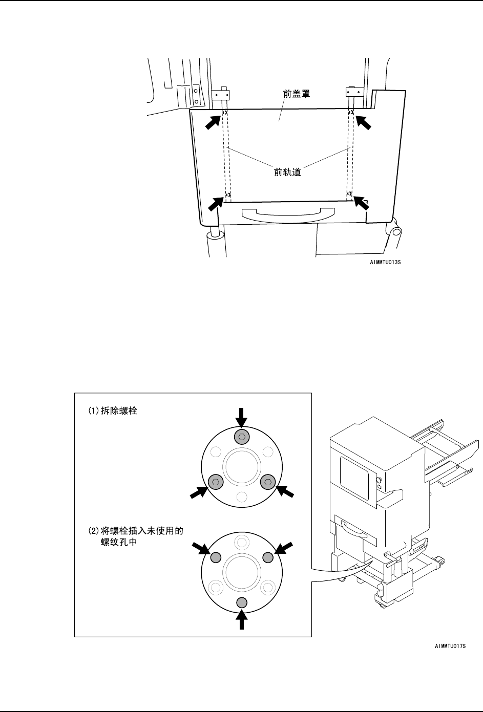 从料盘单元内侧拆除固定前轨道的螺栓 (4 根)。(这个螺栓与前盖罩一起固定。)