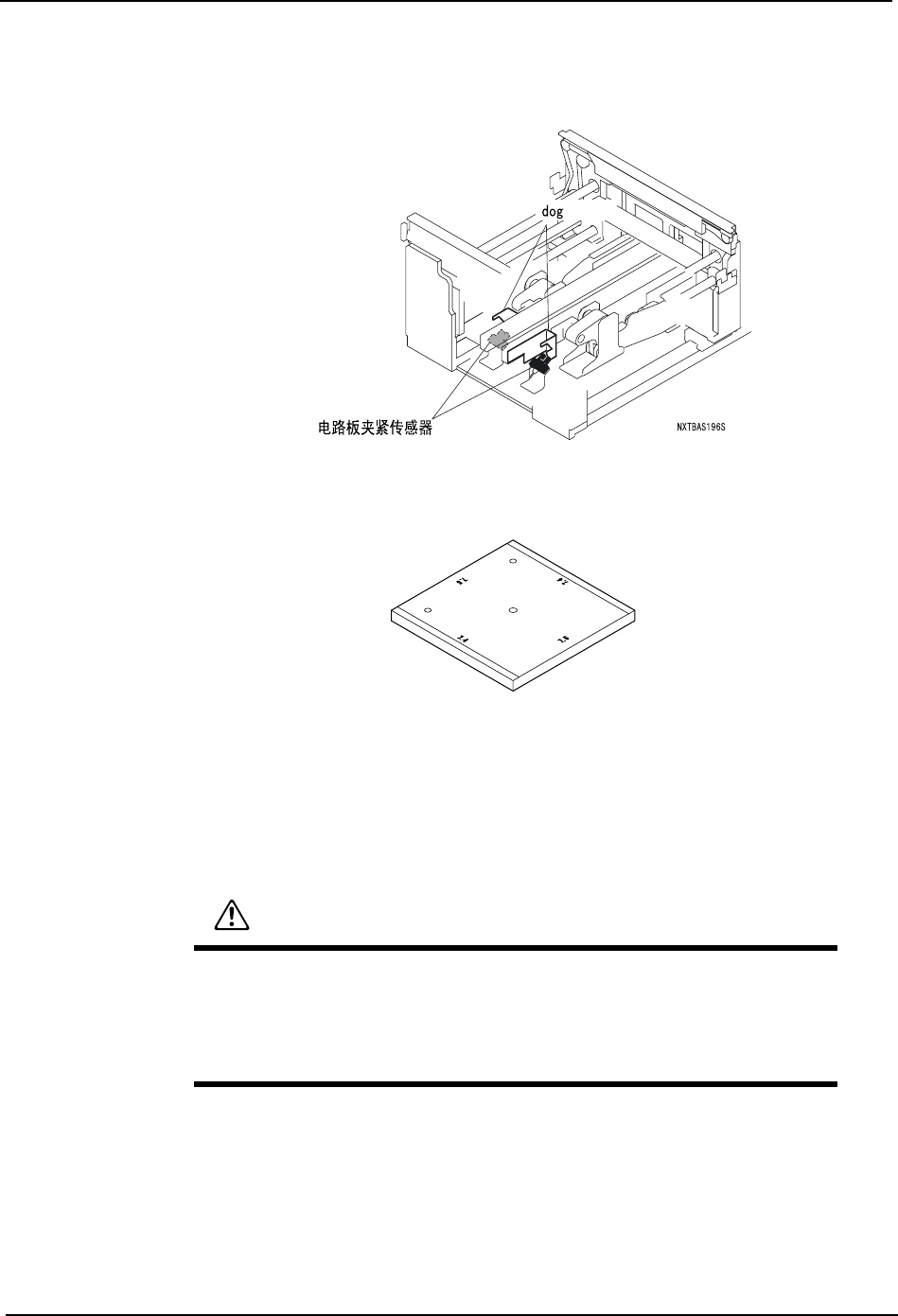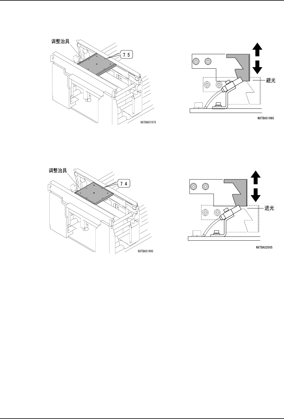 QD029-09 9. 测定和调整 NXT 机械手册 405 9.8 电路板夹紧传感器的调整 电路板夹紧传感器的进光和避光 用移动传感器 dog 的位置进行调整。 9.8.1 准备物品 ·调整治具 PM4577* ·六角扳手 调整治具是 100mm 见方的平板。四边测定部按 厚 7.5mm ± 0.01 以及 7.4mm ± 0.01 加工。 9.8.2 调整方法 1. 请将调整的模组向前方拉出。调整的模组上带有侧板时, 为了 将传感器…