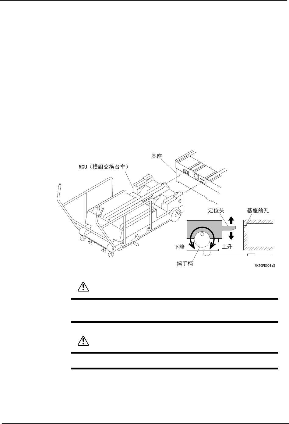 QD029-09 5. 基本操作 NXT 机械手册 83 5.2.2 从模组的基座上拆除 拆除 / 安装时,使用 MCU( 模组更换台车 )。 可以方便地将模组从基座上拆除 ,移动到相同基 座的别的位置上或者移动到别的基座上等 操作。 (1) 停止模组 停止模组的运转、使其处于 START 等待状态。 (2) 将空的 MCU 结合到基座上 a. 将空的 MCU 接近基座前面。 b. 旋转摇手柄、调节高度以使 MCU 的定位头对准基座的孔…